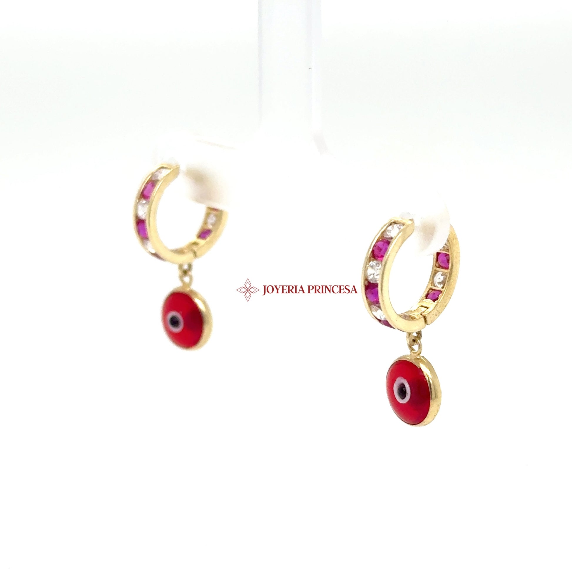 EN: These charming 14K gold huggie earrings feature vibrant red and pink cubic zirconias for a pop of color.