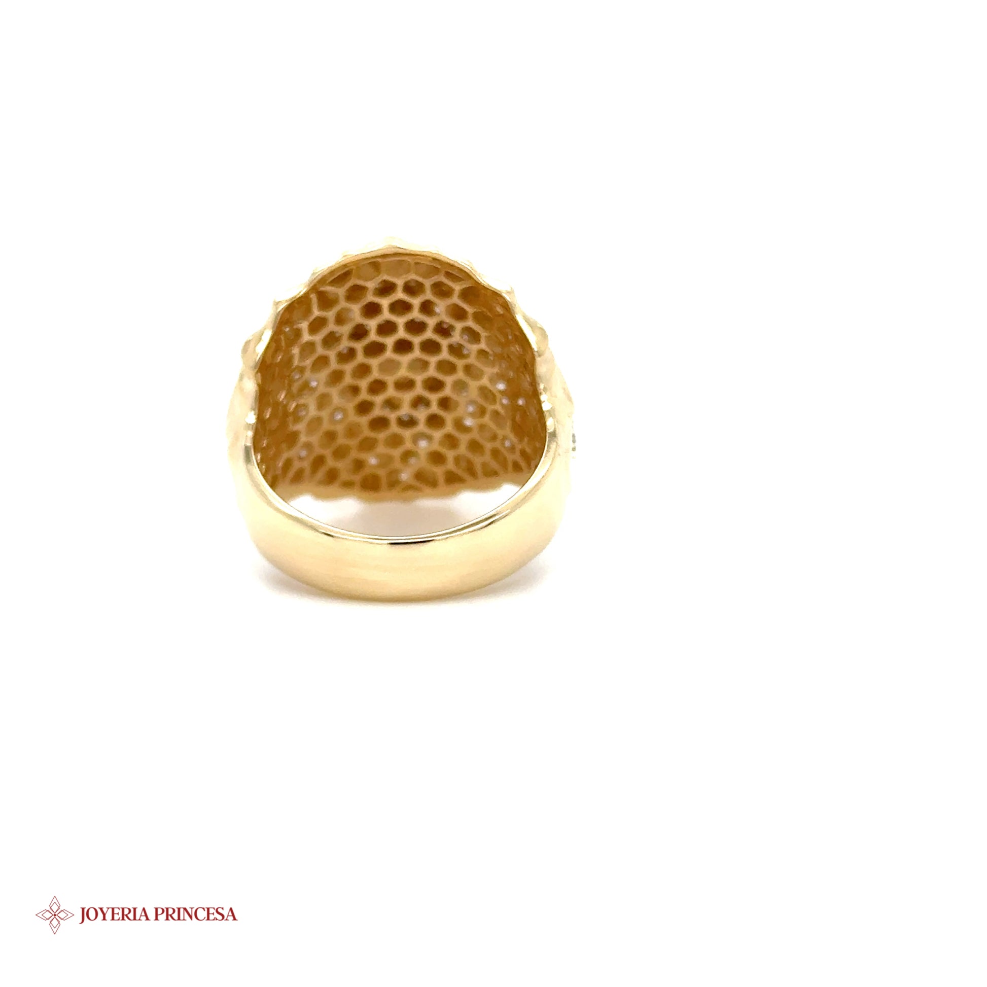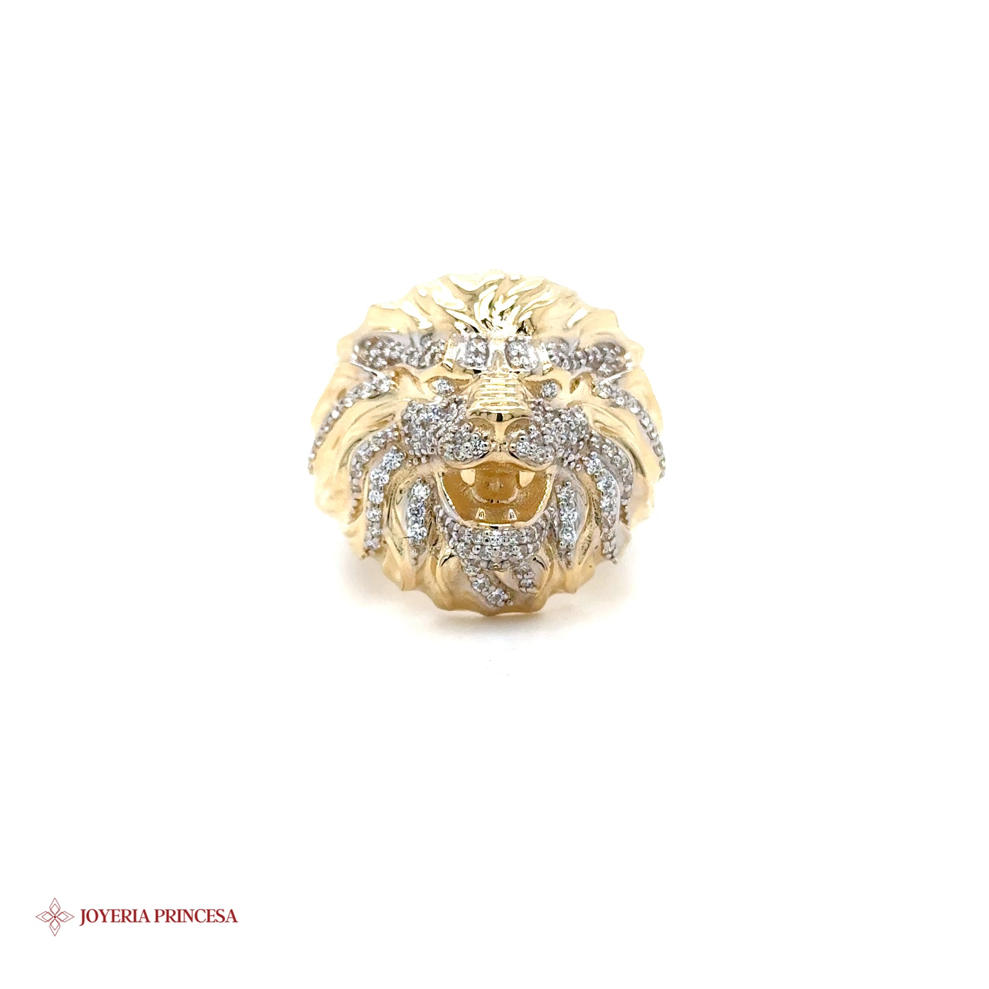 Anillo de oro de 14 quilates con una detallada cabeza de león y detalles de circonitas.