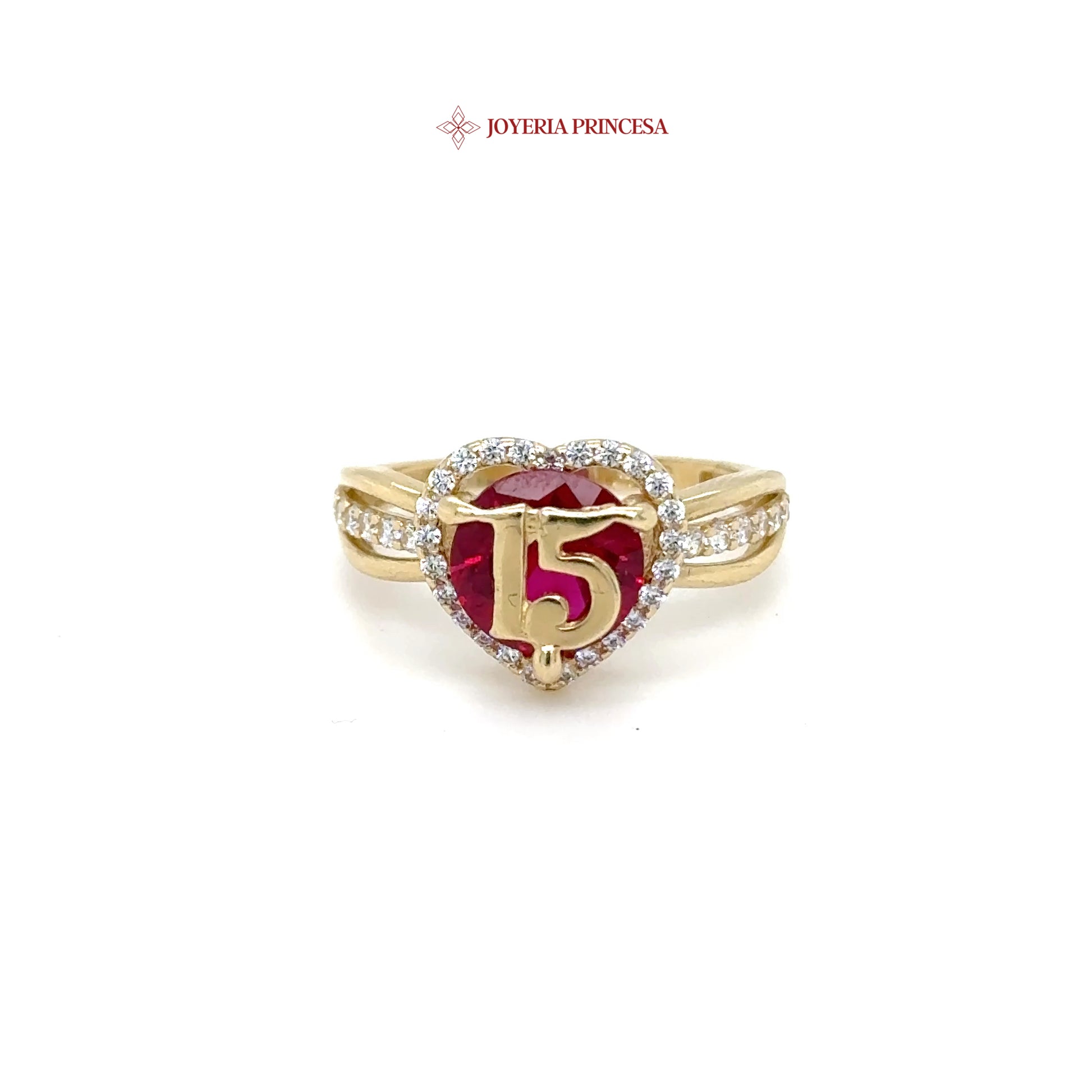 Un anillo de oro de 14 quilates con una piedra de corazón rojo y el detalle "15". Perfecto para un recuerdo de quinceañera.