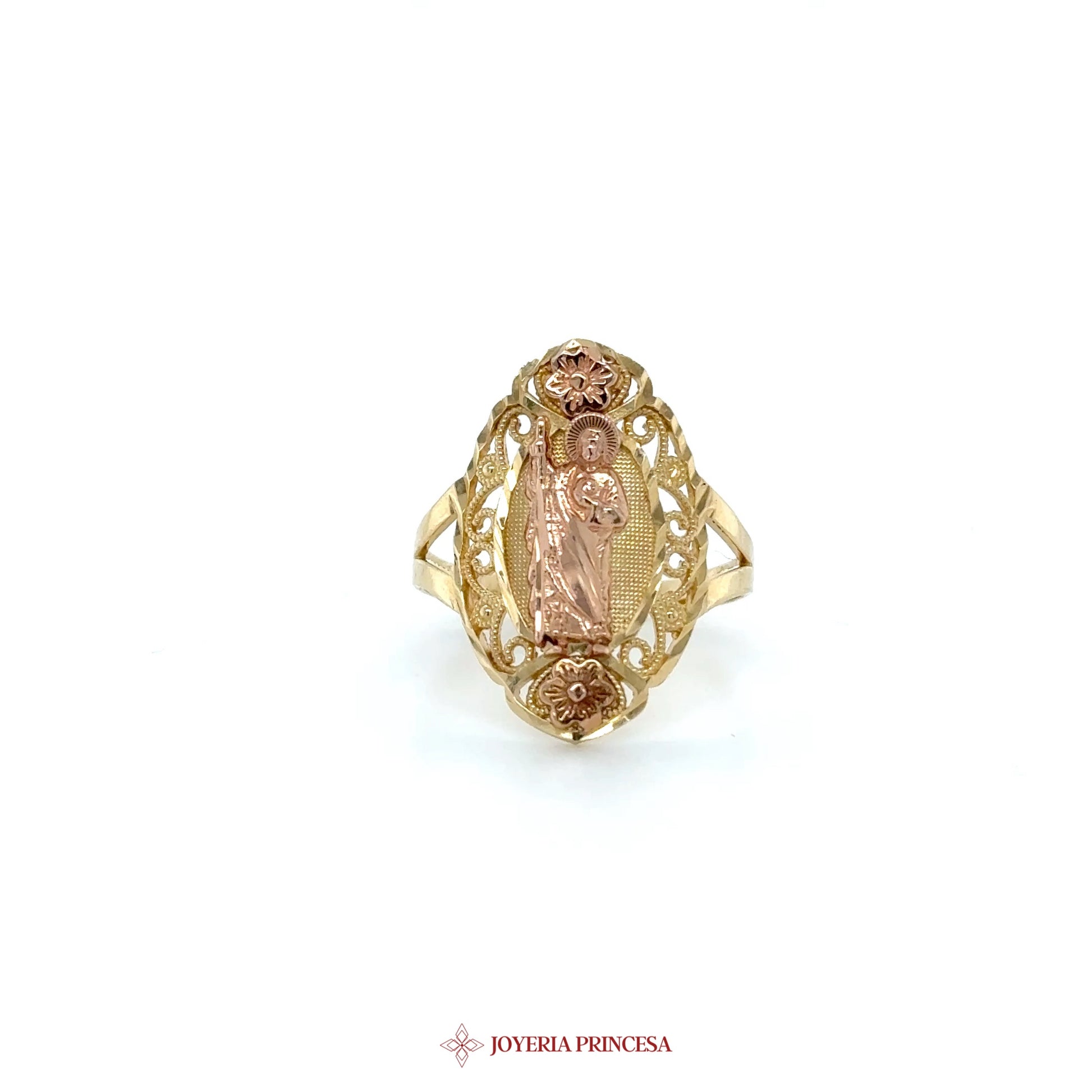 EN: A beautiful 14K gold ring featuring San Judas surrounded by floral designs. • Exquisite craftsmanship • Unique religious motif • Perfect for special occasions ES: Un hermoso anillo de oro de 14K con San Judas rodeada de diseños florales. • Artesanía exquisita • Motivo religioso único • Perfecto para ocasiones especiales