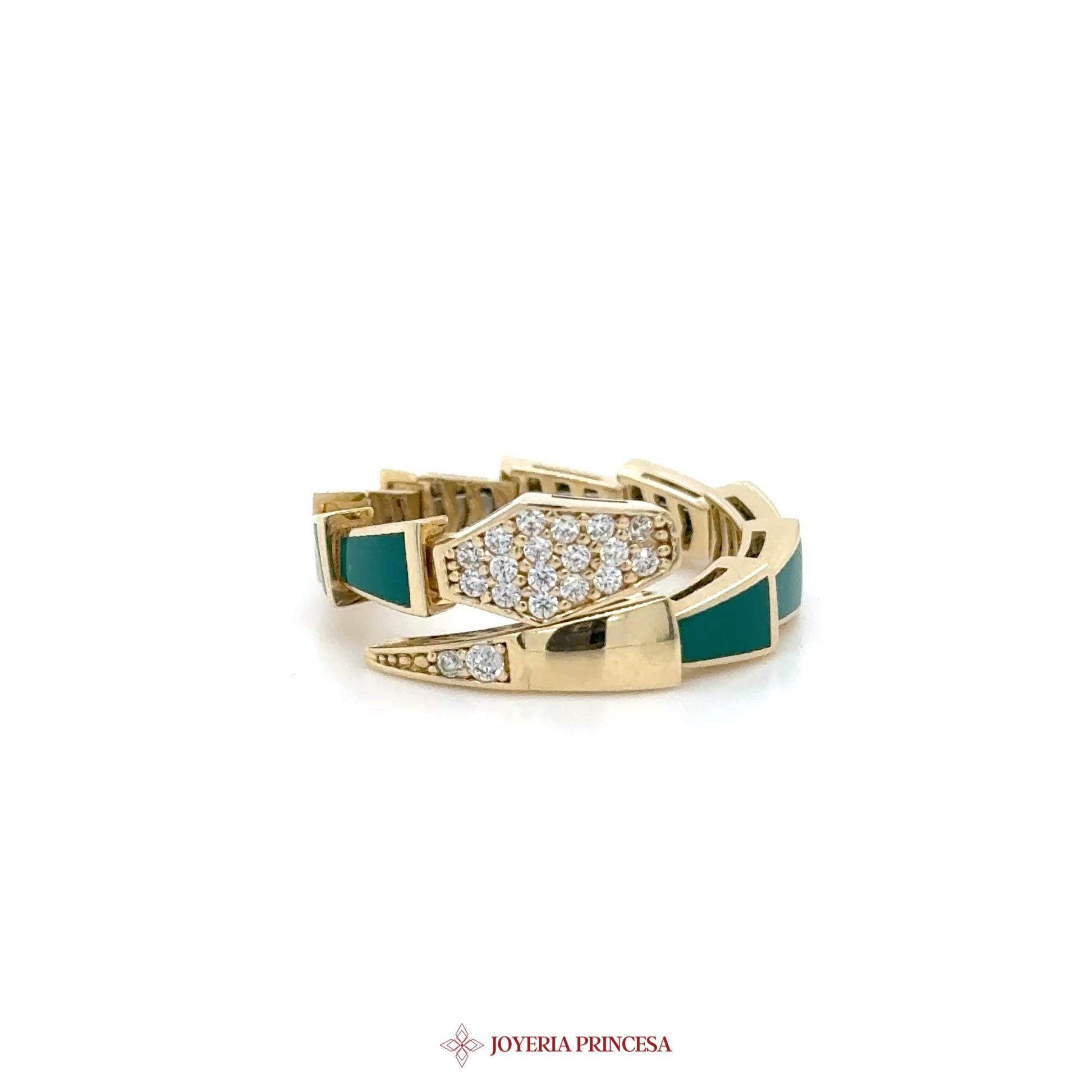 ES: Abraza la elegancia con este impresionante anillo de motivo de serpiente. • Fabricado en oro de 14K • Con acentos de esmalte verde vibrante • Adornado con piedras CZ brillantes