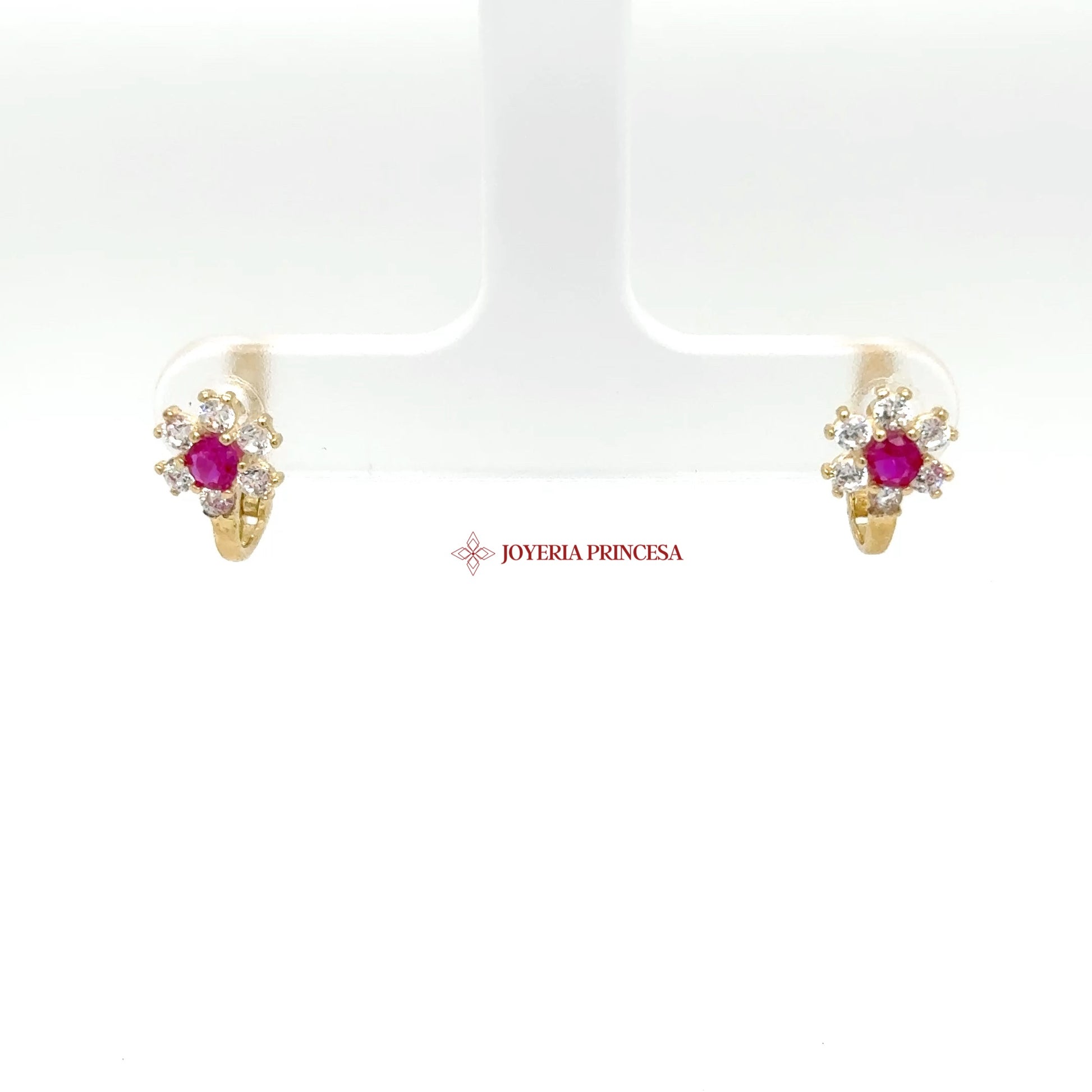 ES: Estos encantadores aretes de oro de 14K cuentan con vibrantes circonitas cúbicas rubí rodeadas de un delicado diseño floral.