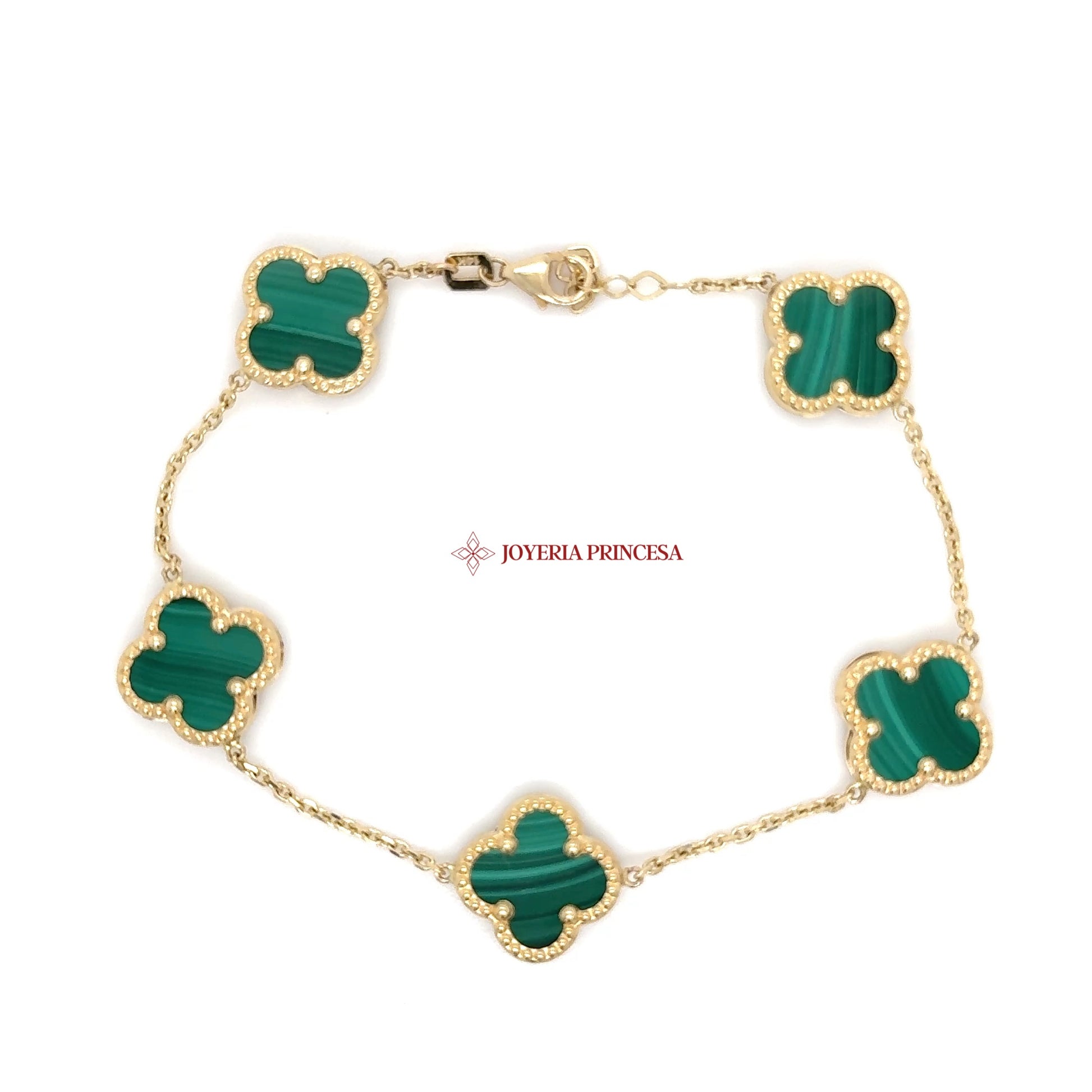 Exquisitely crafted, this bracelet features vibrant green malachite charms encased in lustrous 14K gold, connected by a delicate chain.