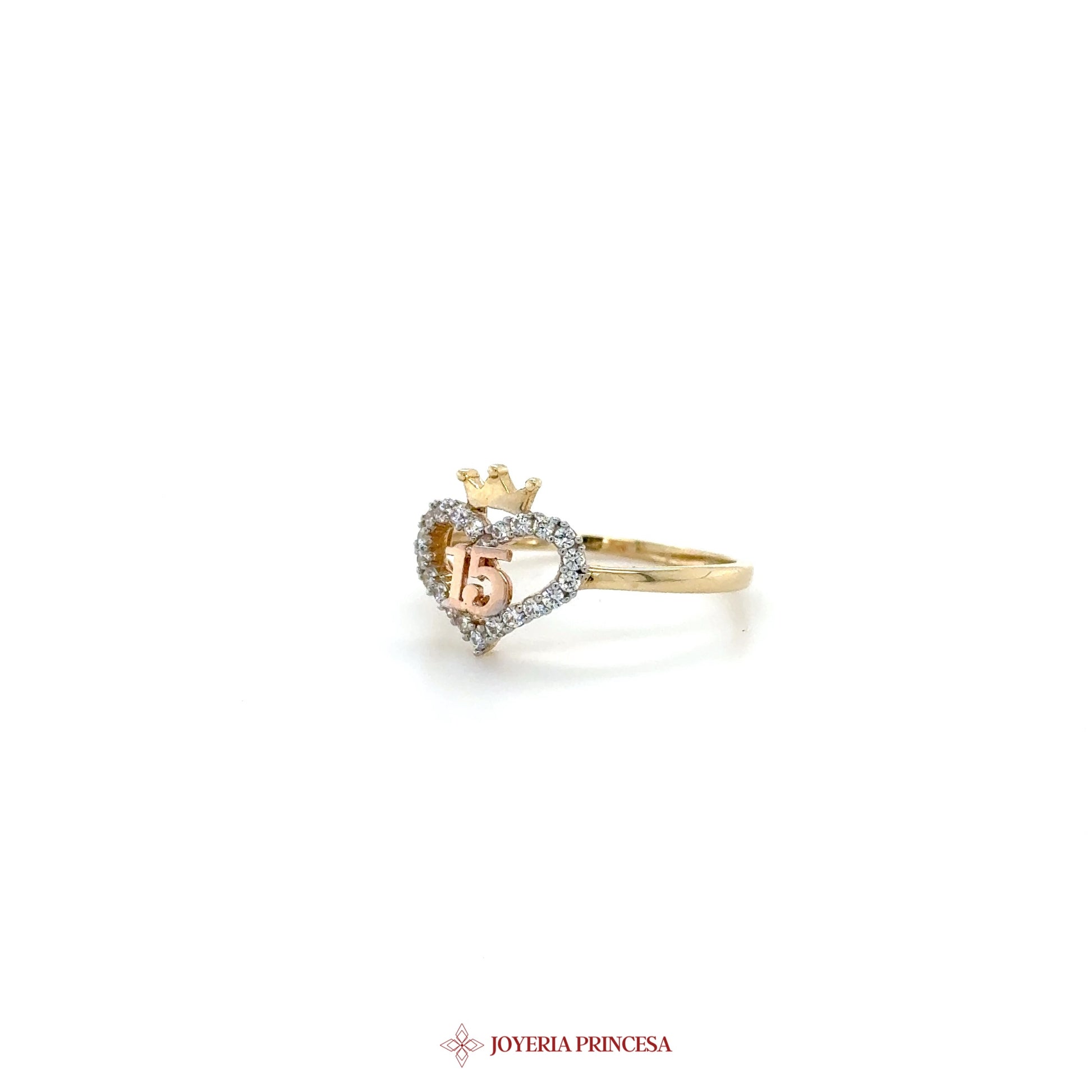 EN: Celebrate a special moment with this charming heart-shaped quinceanera ring featuring a crown and sparkling zirconia stones. • Crafted in 14K gold • Heart design with number 15 • Elegant crown motif