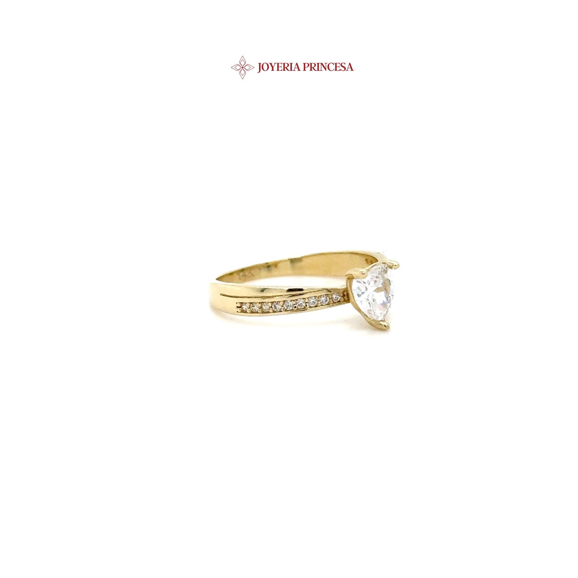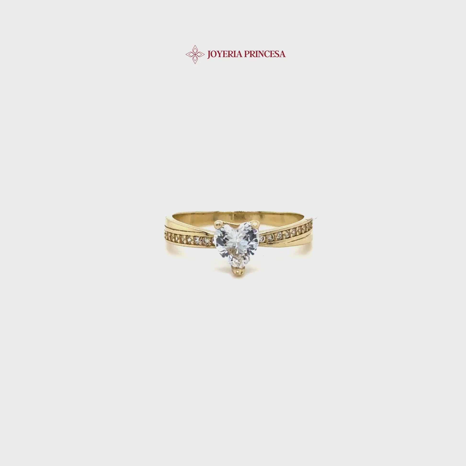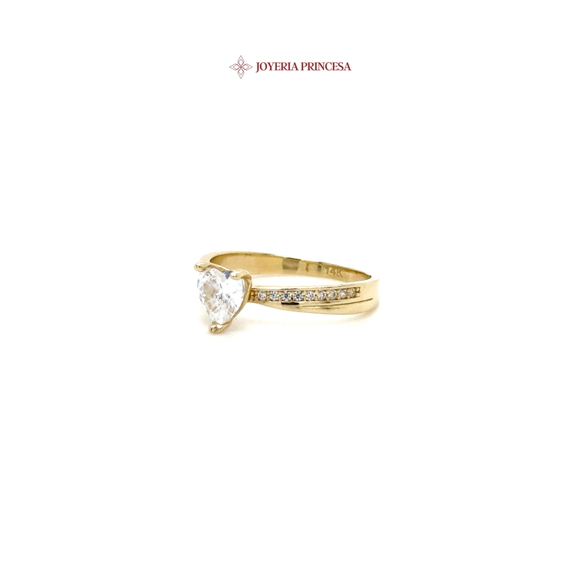 The 14K gold ring features a sparkling heart-shaped stone. Smaller stones line the band, adding extra brilliance.