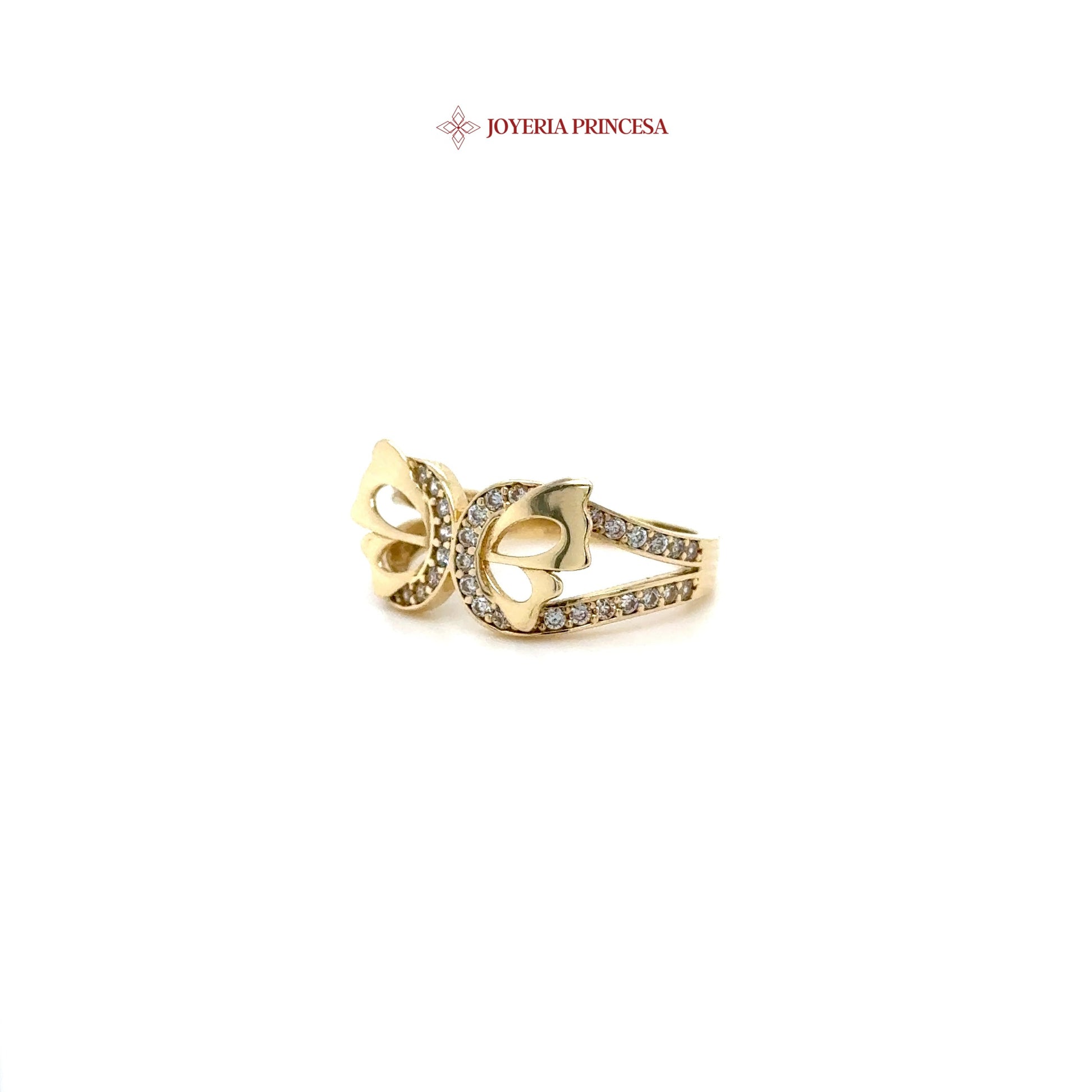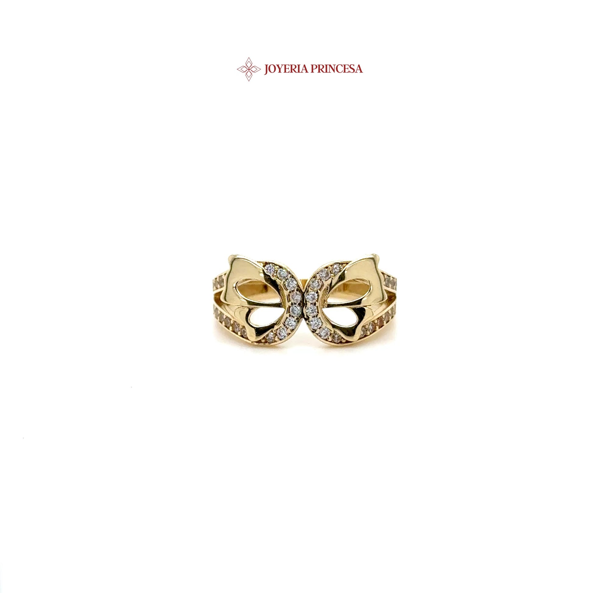 This 14K gold ring features a unique butterly-shaped design. Sparkling stones accentuate its elegant split band.
