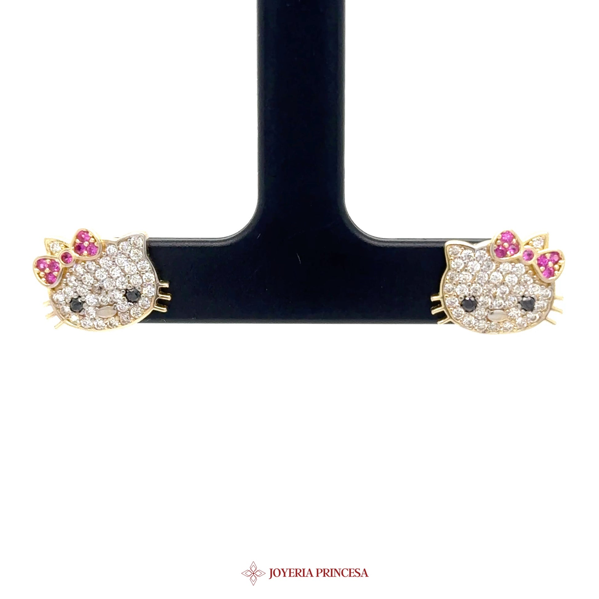 ES: Adorna tus orejas con estos encantadores pendientes de botón de Hello Kitty en 14K con lazos rosas y piedras CZ brillantes. • Diseño lindo de Hello Kitty • Acentos de lazo rosa • Elaborado en oro de 14K