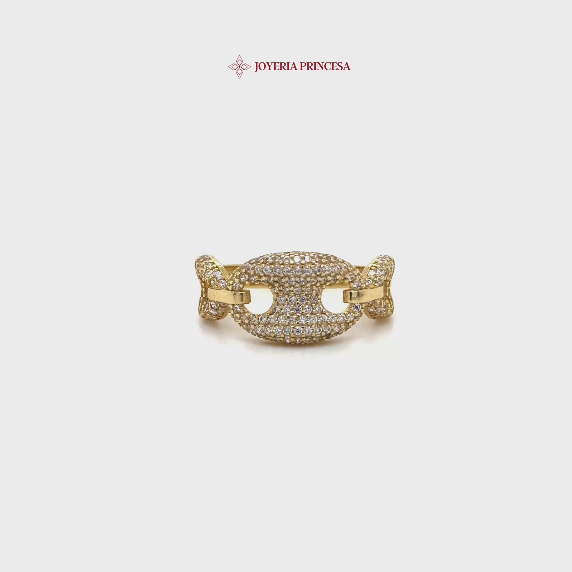 The 14K gold ring features a unique link design. It is embellished with small sparkling stones.