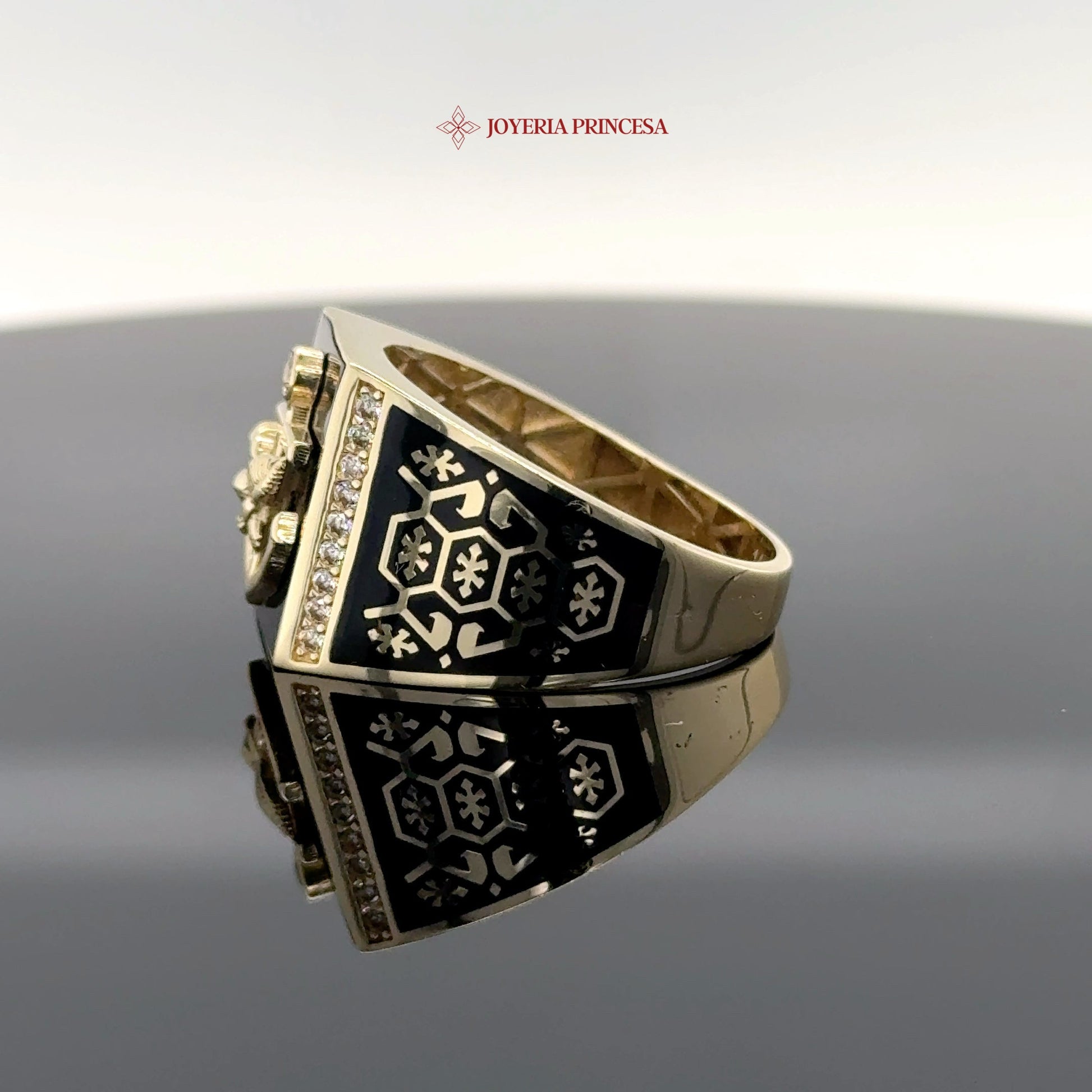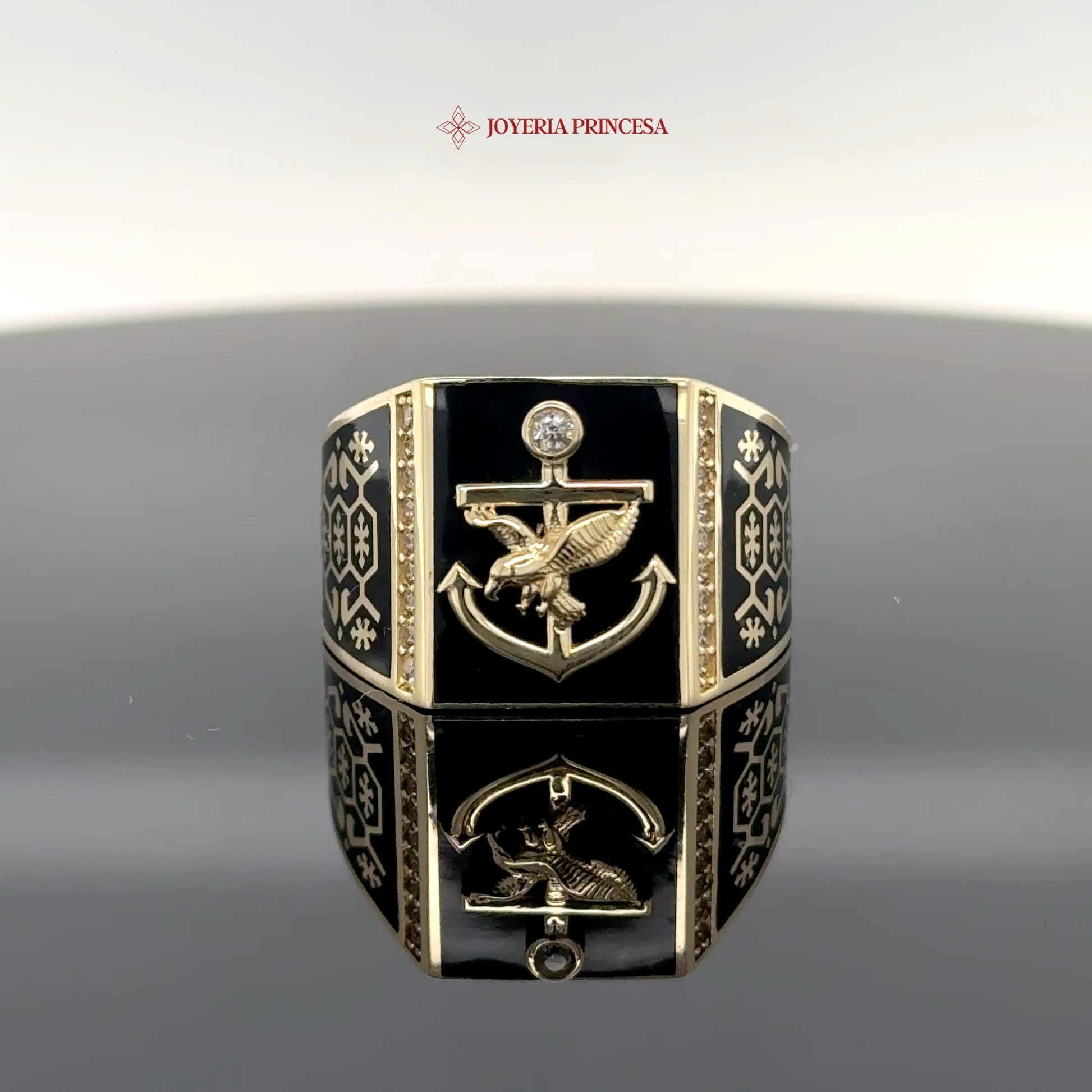 The 14K gold ring features an anchor and eagle design set against a black background. It is enhanced by intricate patterns on the sides and small diamonds.