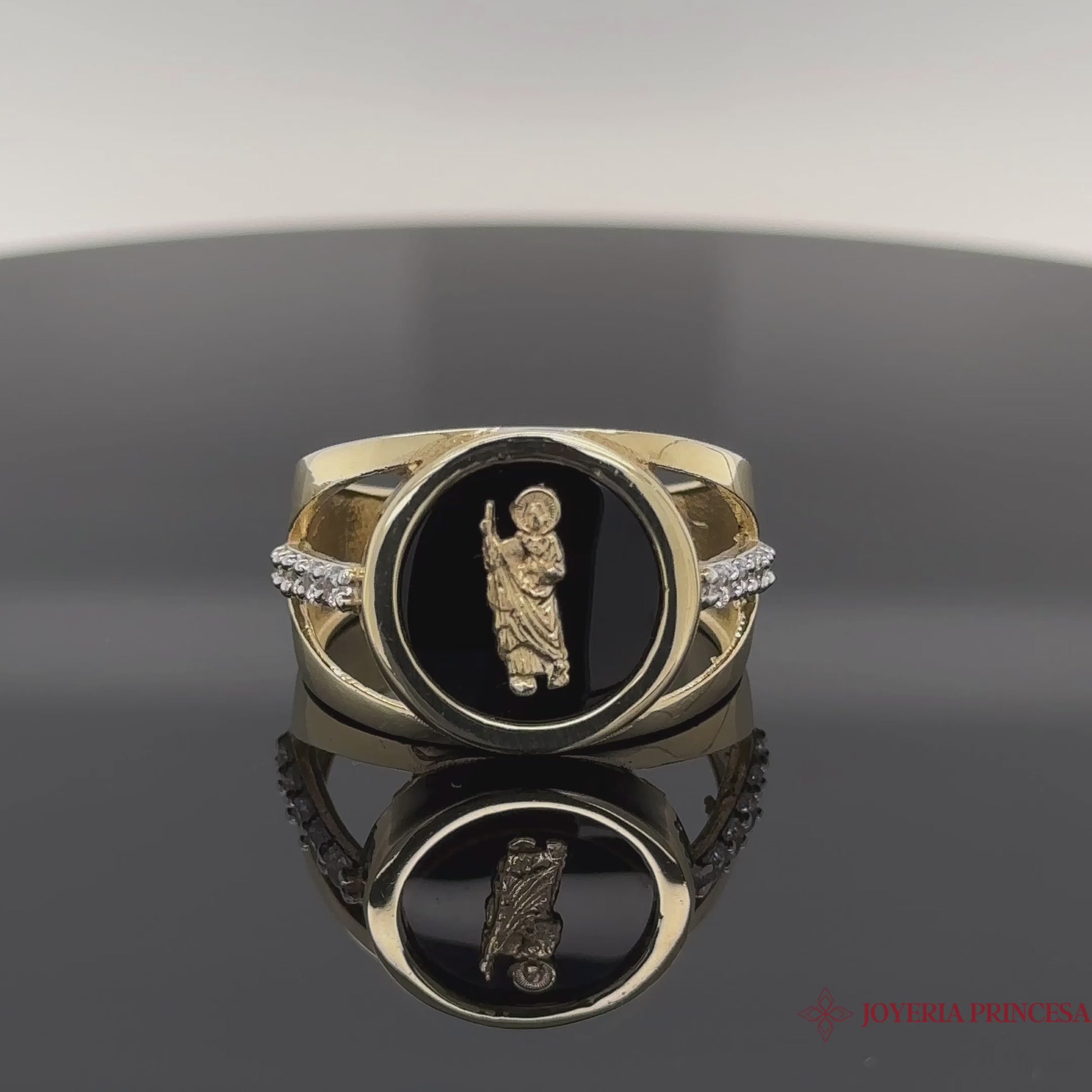 Eleve su estilo con el lujoso anillo de ónice San Judas de oro de 10 quilates. Con un intrincado diseño y una magnífica artesanía, esta pieza atemporal muestra una hermosa imagen de San Judas grabada en la piedra de ónix negro. Adecuado para diversas ocasiones.