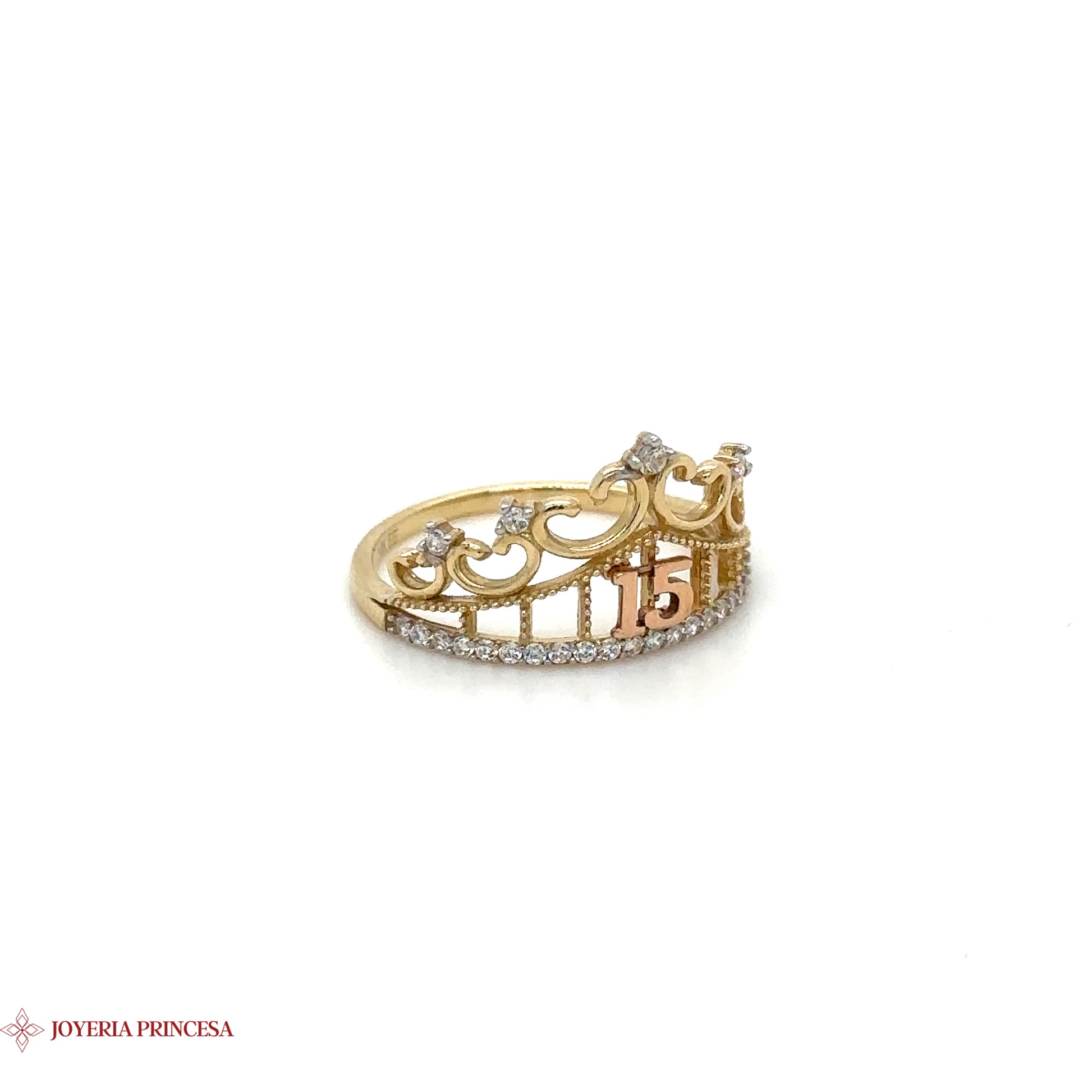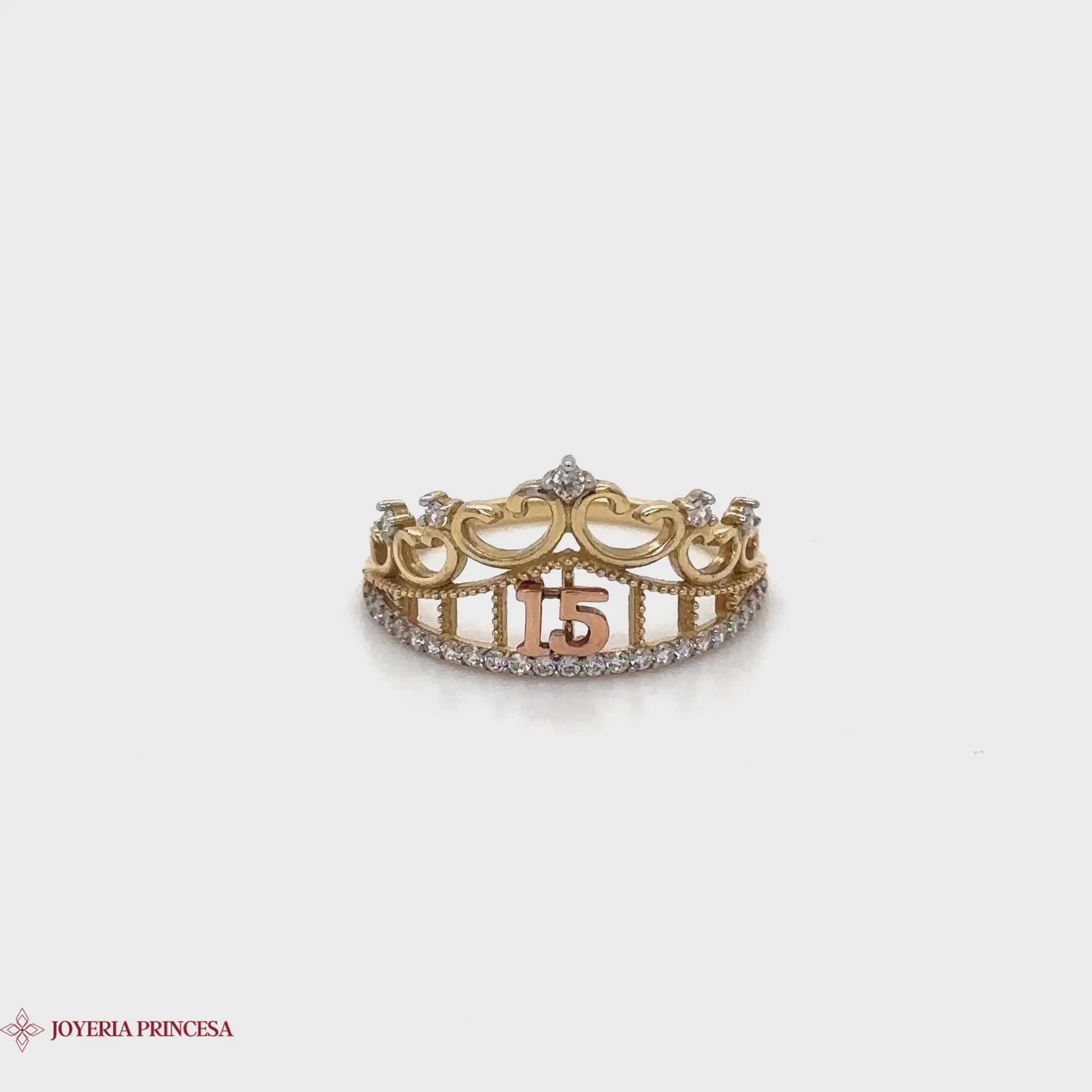 Celebra los 15 años de una quinceañera con nuestro elegante anillo corona de oro con motivo "15" y cristales. Simbolizando la feminidad, este anillo estilo tiara en oro de primera calidad es ideal para las celebraciones de Quinceañera.