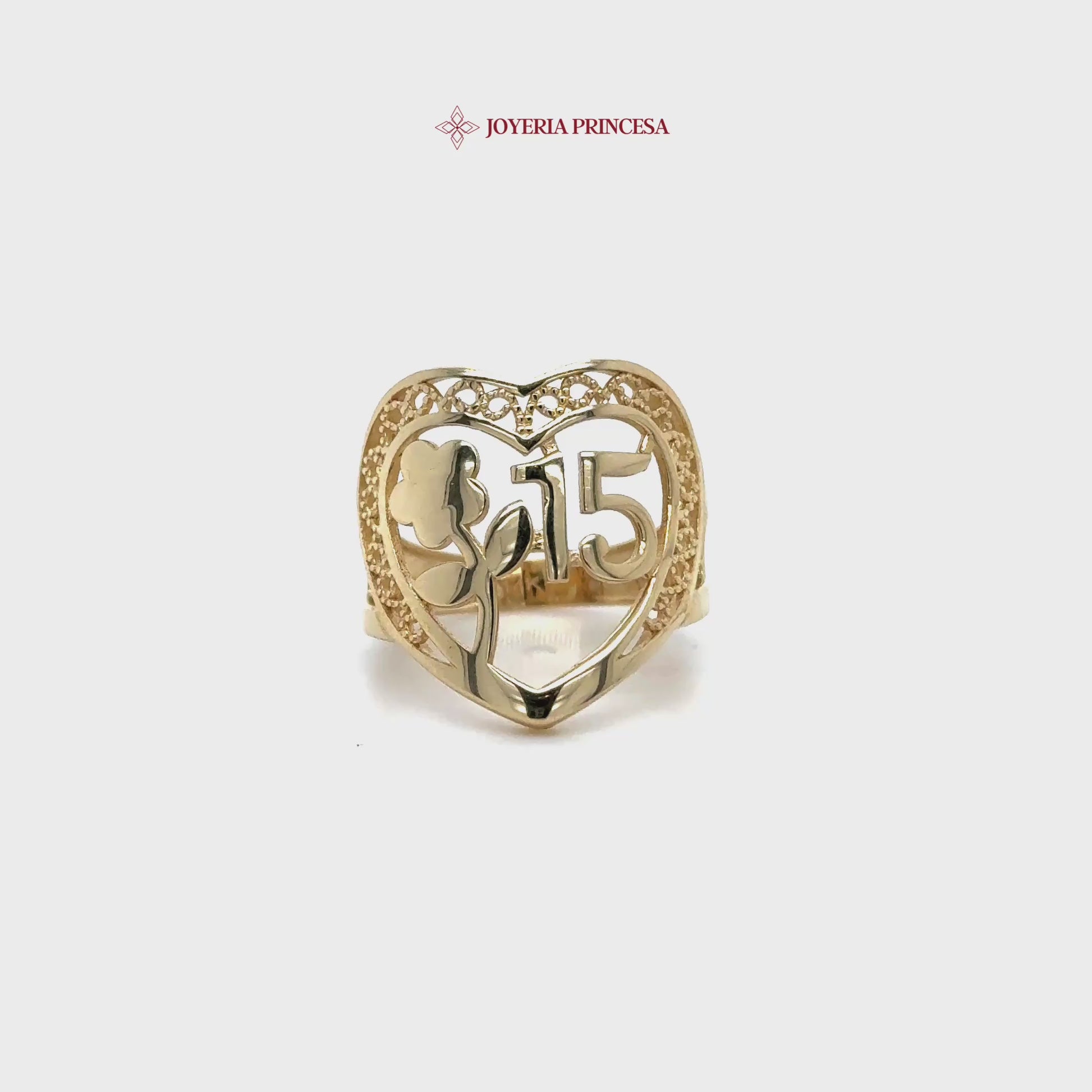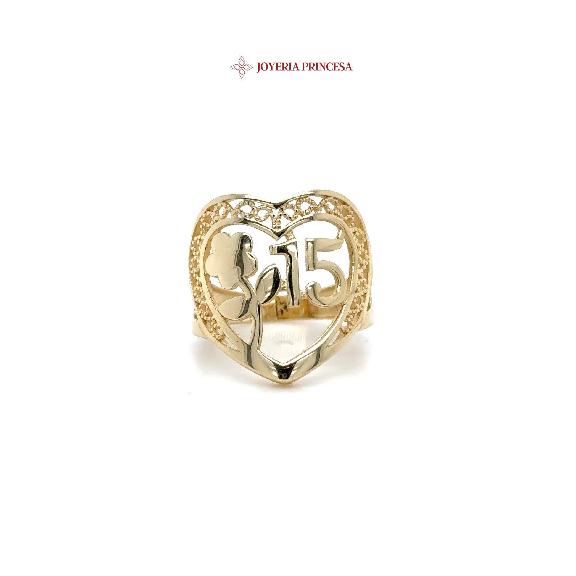 This 14K gold ring features a unique design with a prominent "15" at the center. Its delicate filigree work adds an elegant touch.