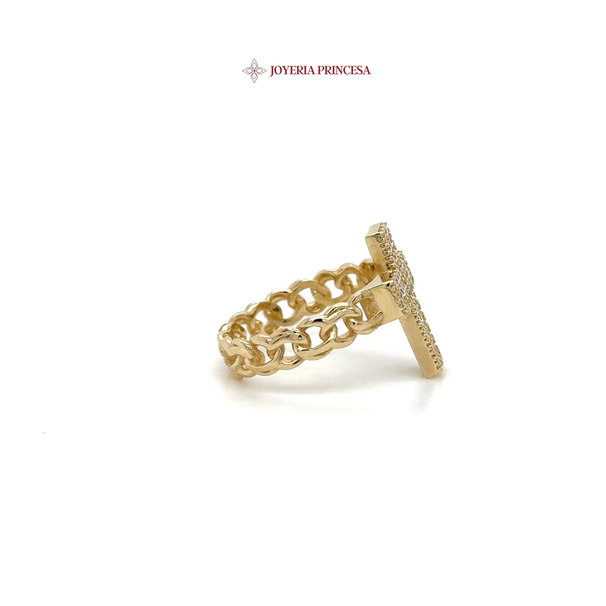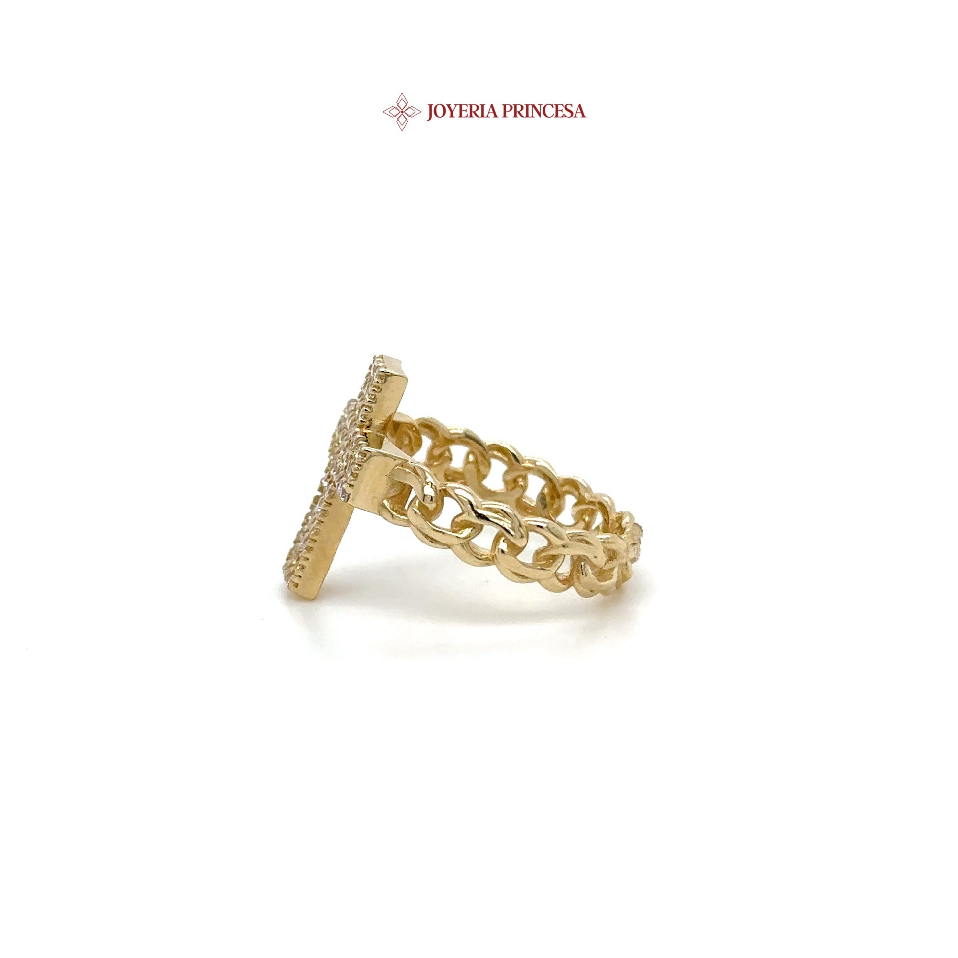 This 14K gold ring features a bold cross encrusted with small diamonds. The band is crafted with a chain-link design for an elegant look.