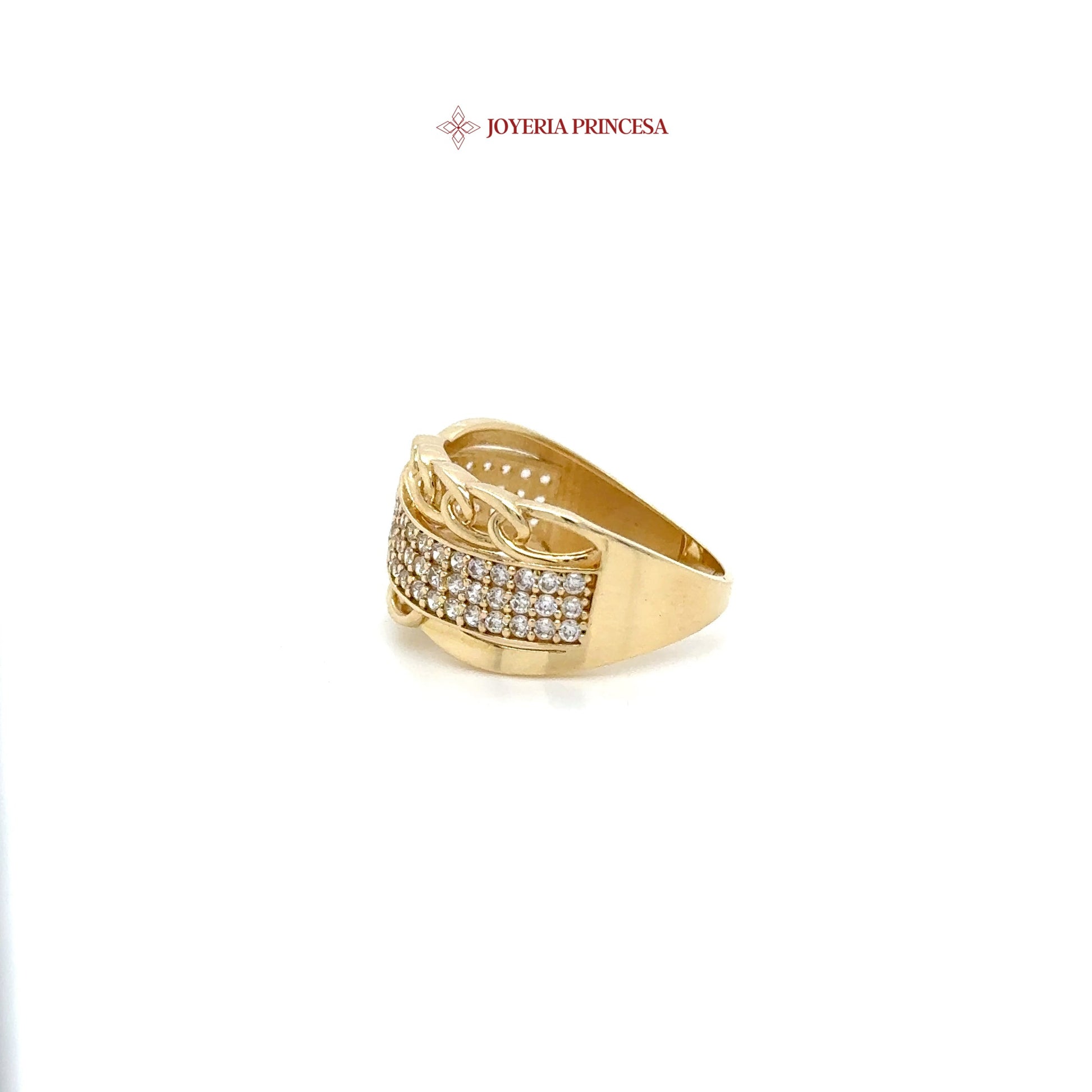 The 14K gold ring features an intricate design with sparkling gemstones. It combines elegance with a touch of modern flair.