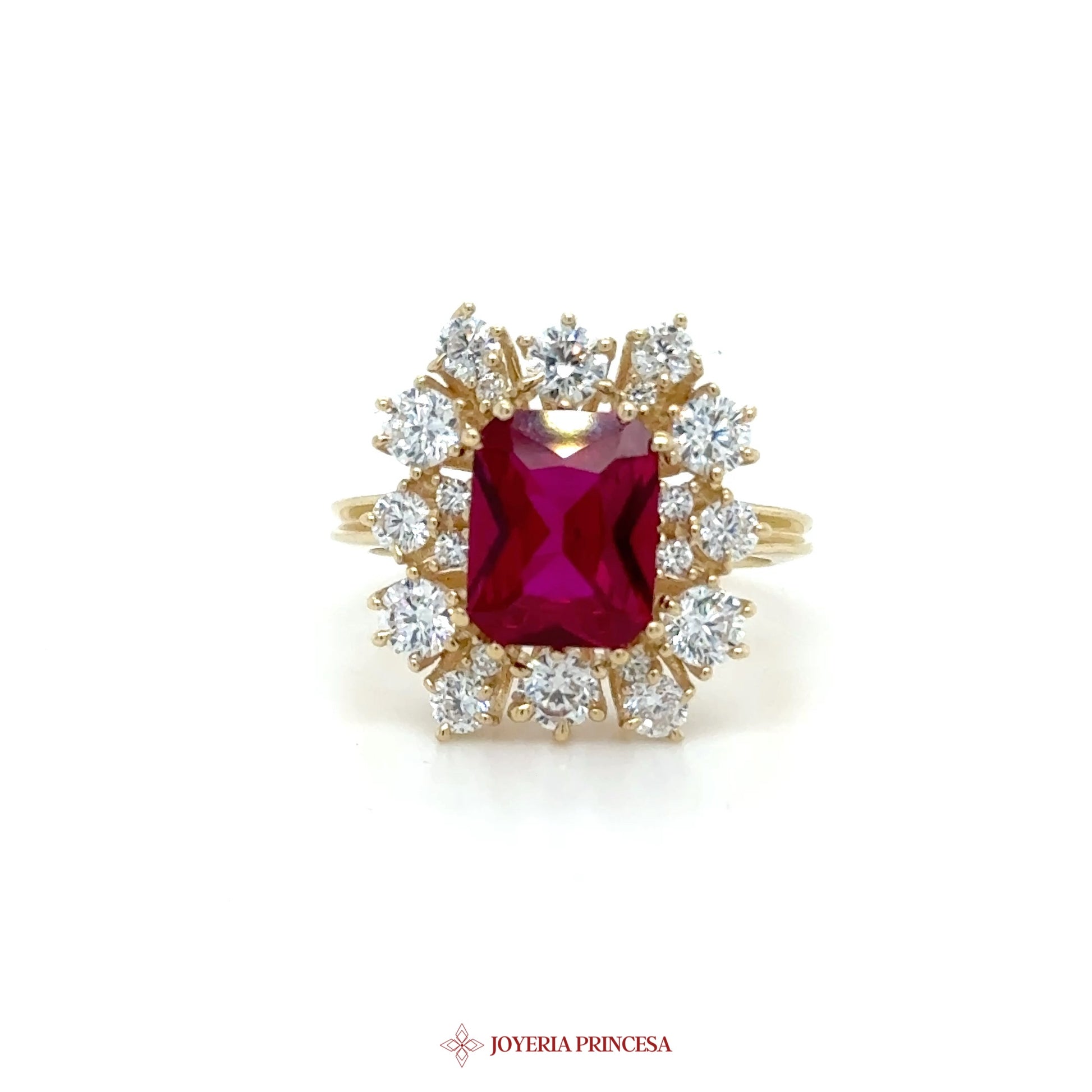 ES: Este impresionante anillo de oro de 14K presenta una vibrante piedra central de rubí rodeada de deslumbrantes CZ. • Diseño de halo elegante • Perfecto para ocasiones especiales • Una adición atemporal a tu colección de joyas.