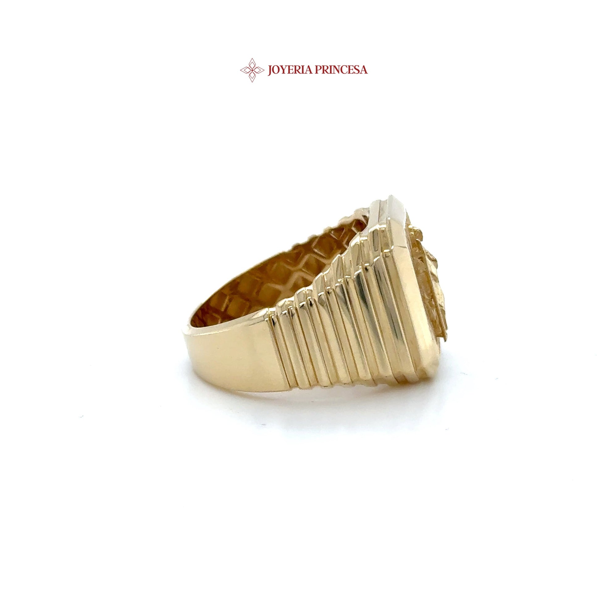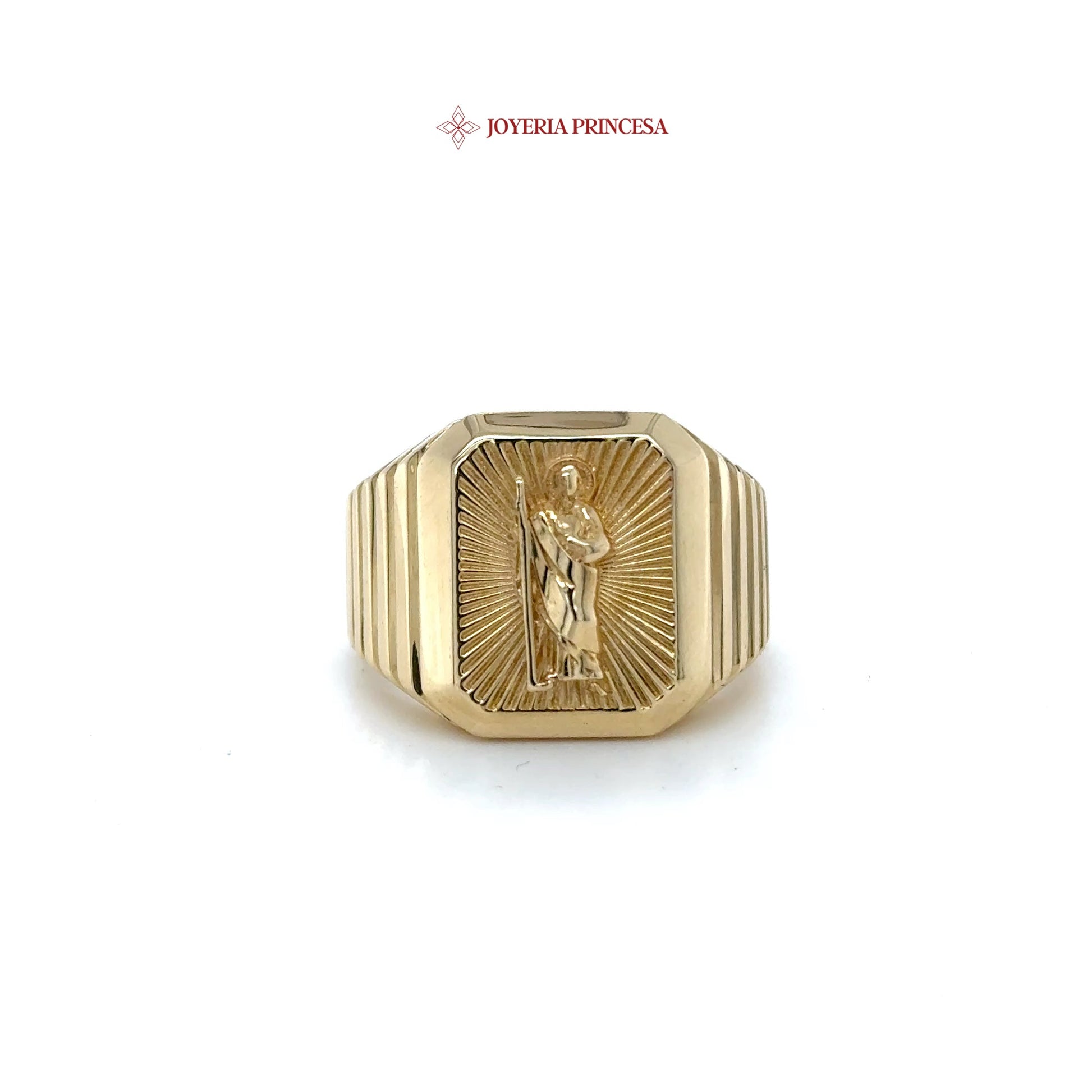 The 14K gold ring features a central design of a saintly figure. Its band is detailed with horizontal grooves for added texture.