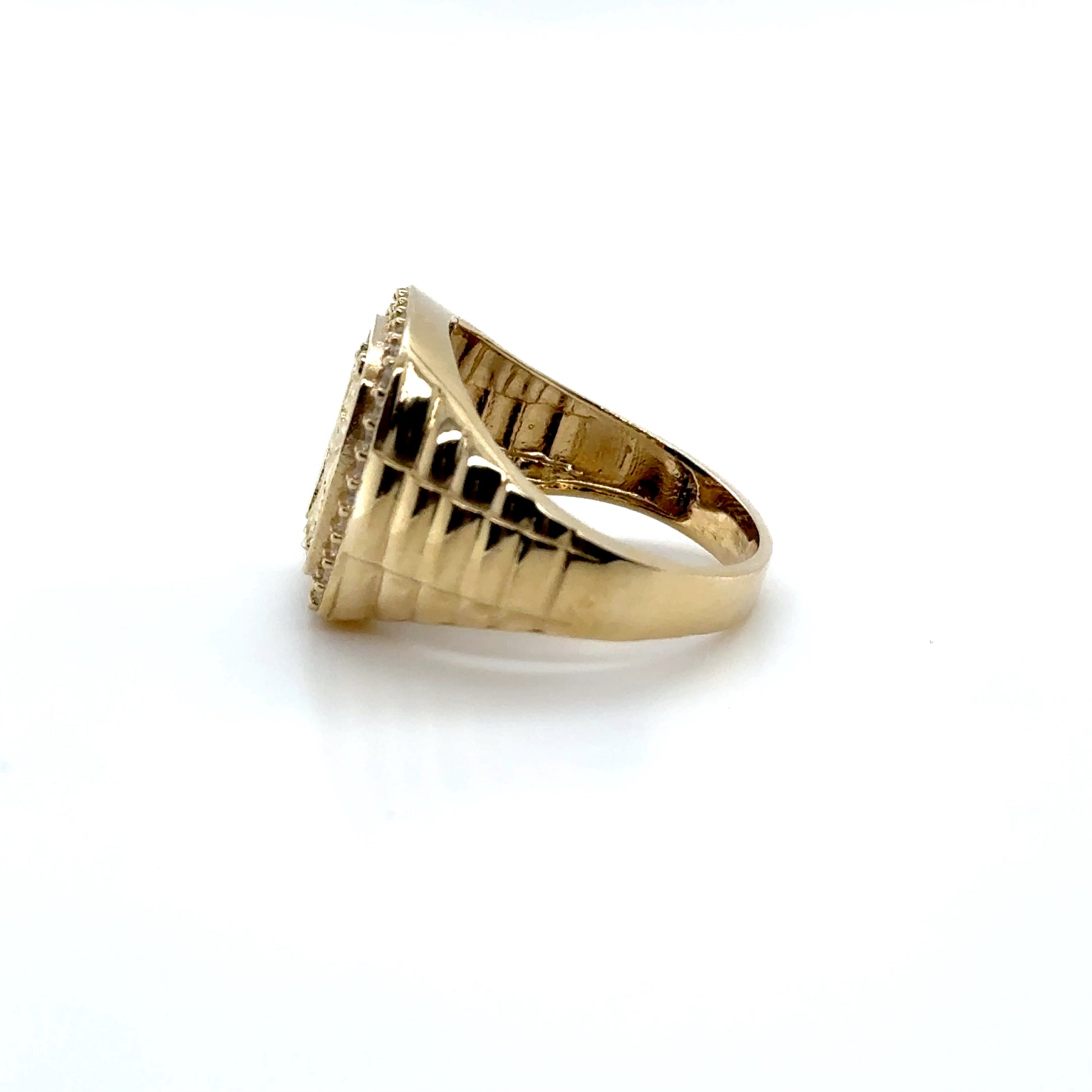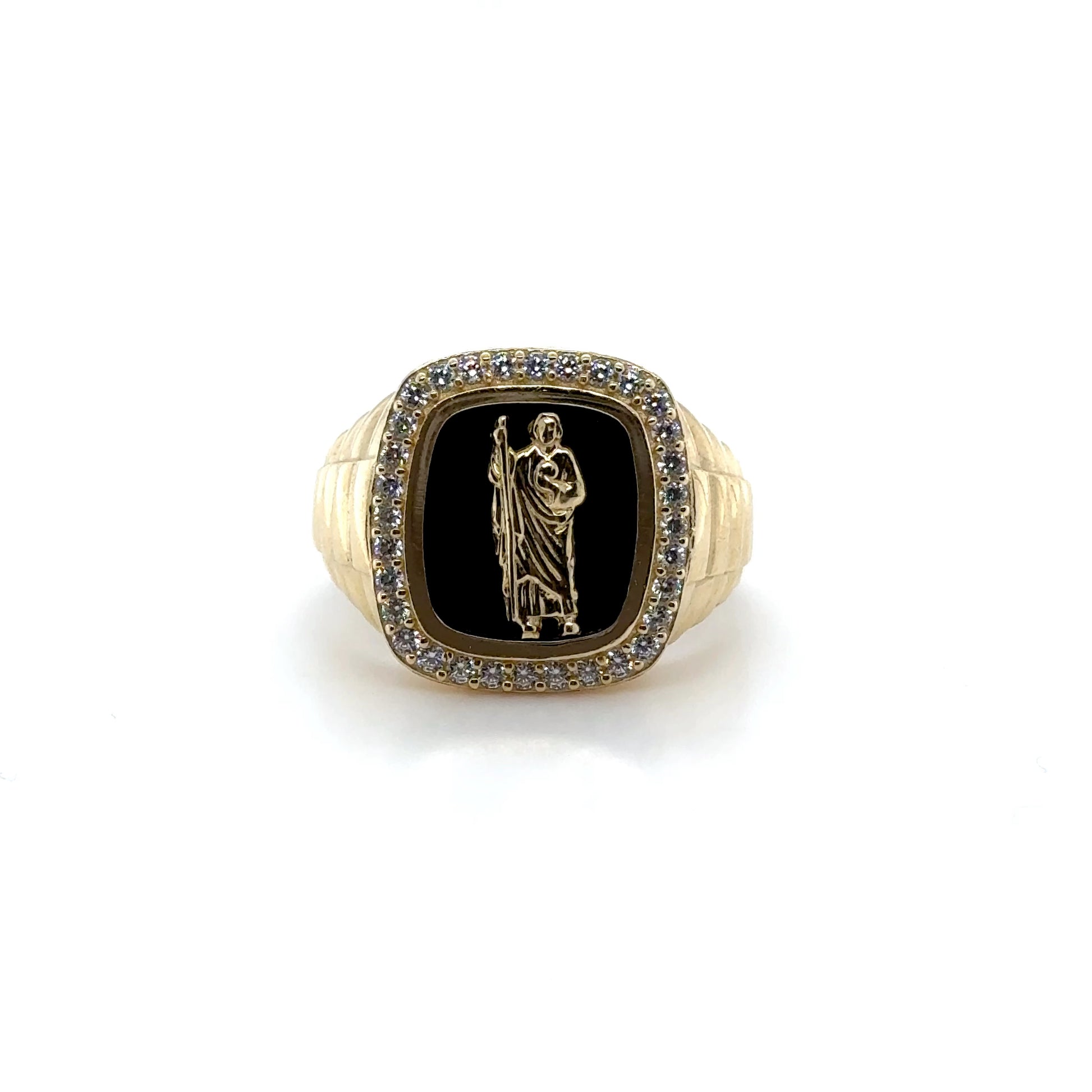 Este anillo para hombre combina con elegancia ónice negro, diamantes y oro de 14 quilates con la figura grabada de San Judas. El diseño único del vástago acanalado simboliza la fe y el estilo.