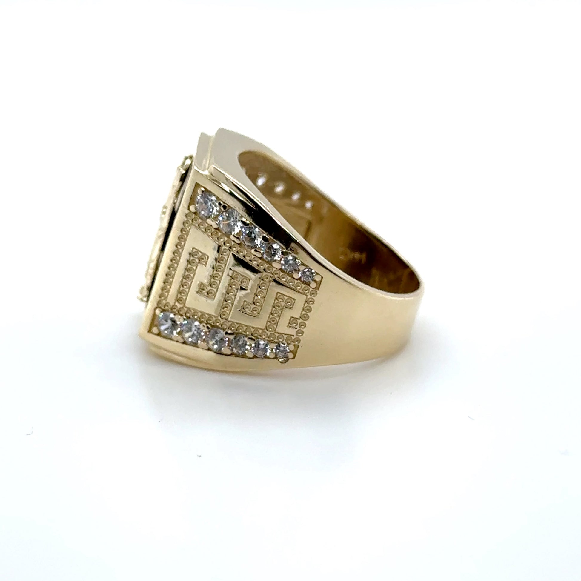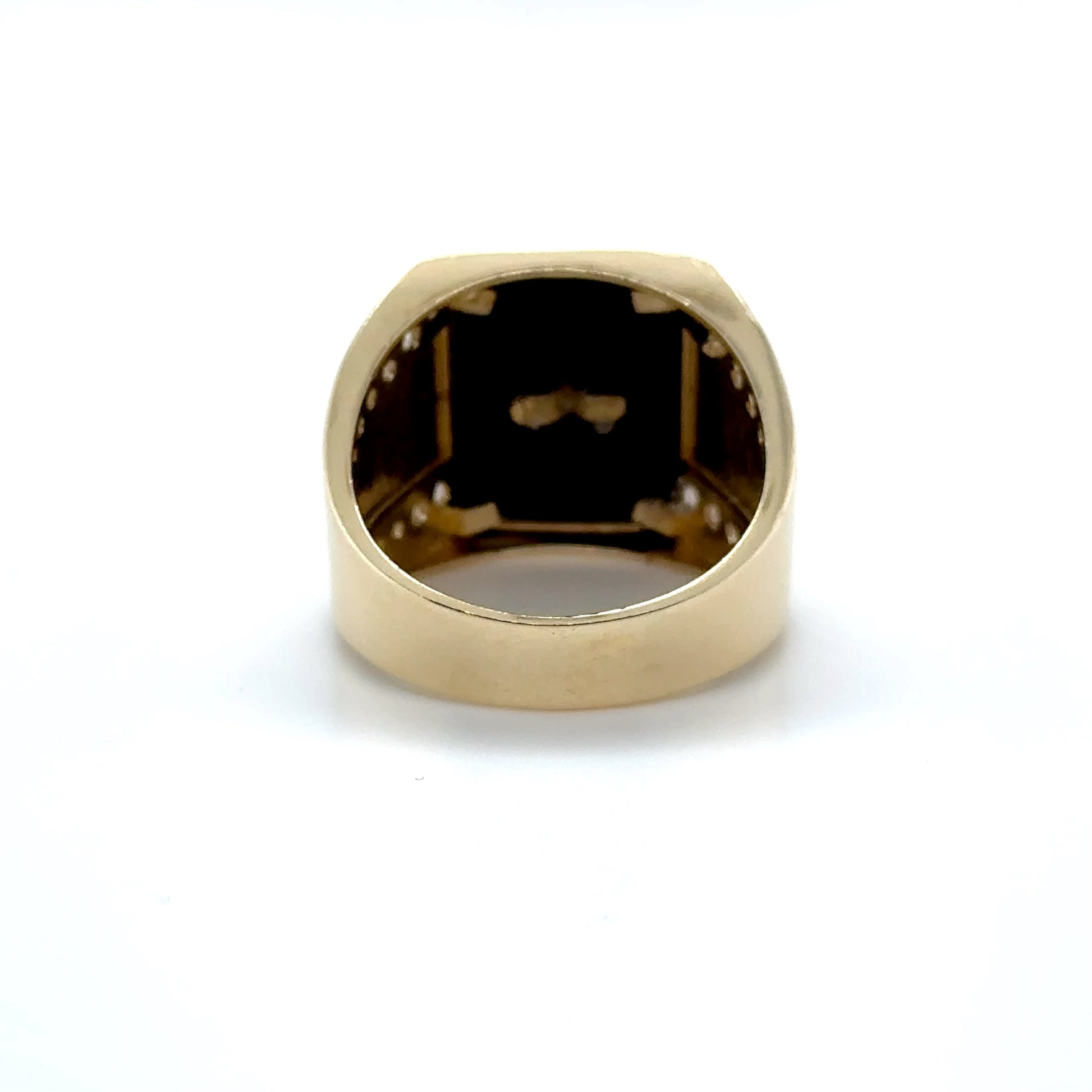 Elegante anillo de oro de 14 quilates para caballero con incrustación de ónice negro, grabado de San Judas y diseño de llave griega engastada con diamantes. Características principales: