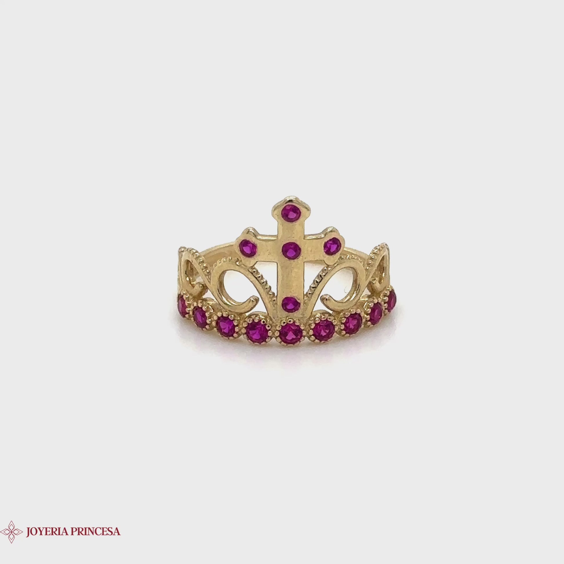 Deléitese con el encanto de la realeza con el Anillo Tiara de Oro adornado con rubíes. Con una silueta de tiara, gemas radiantes, acabado en oro y una artesanía impecable.
