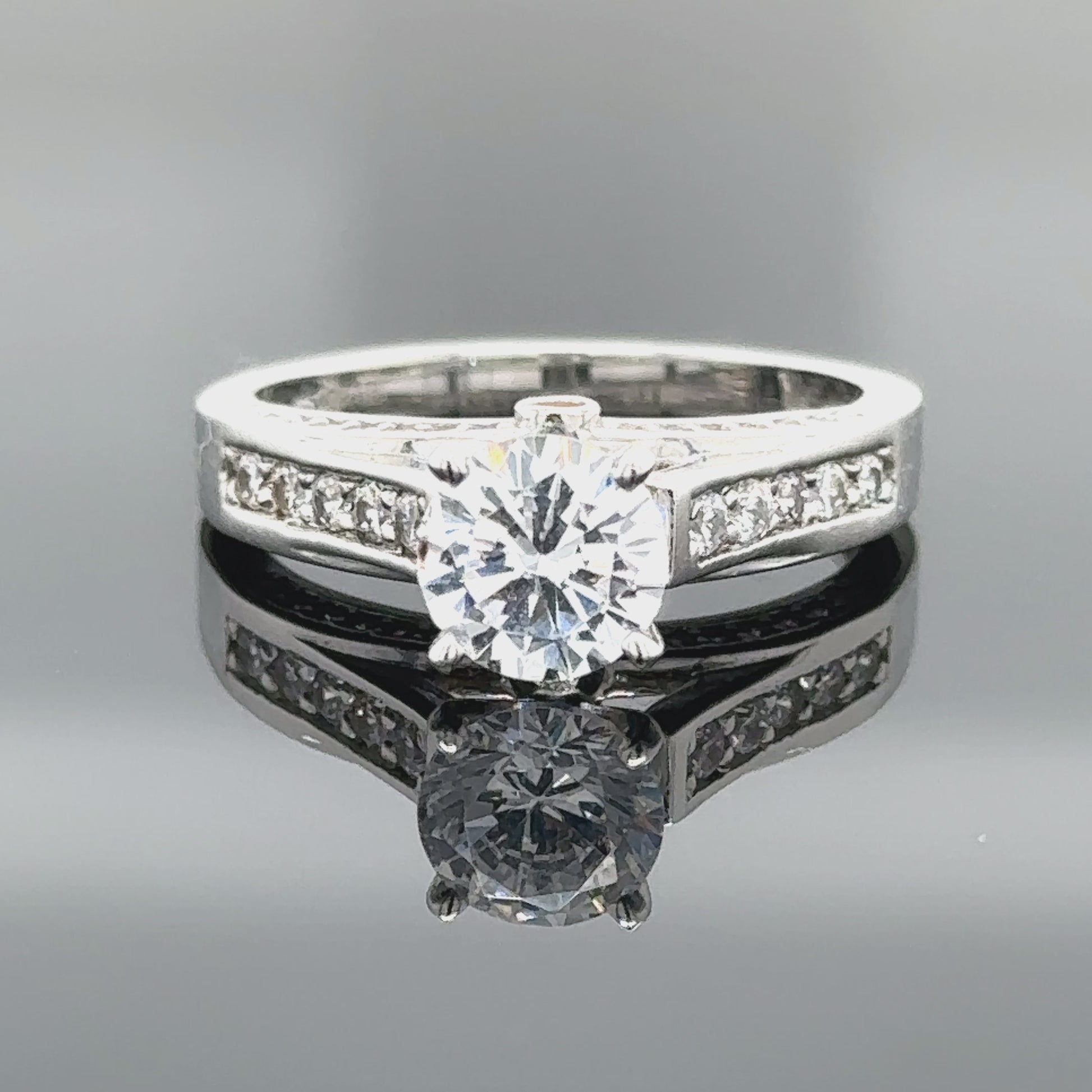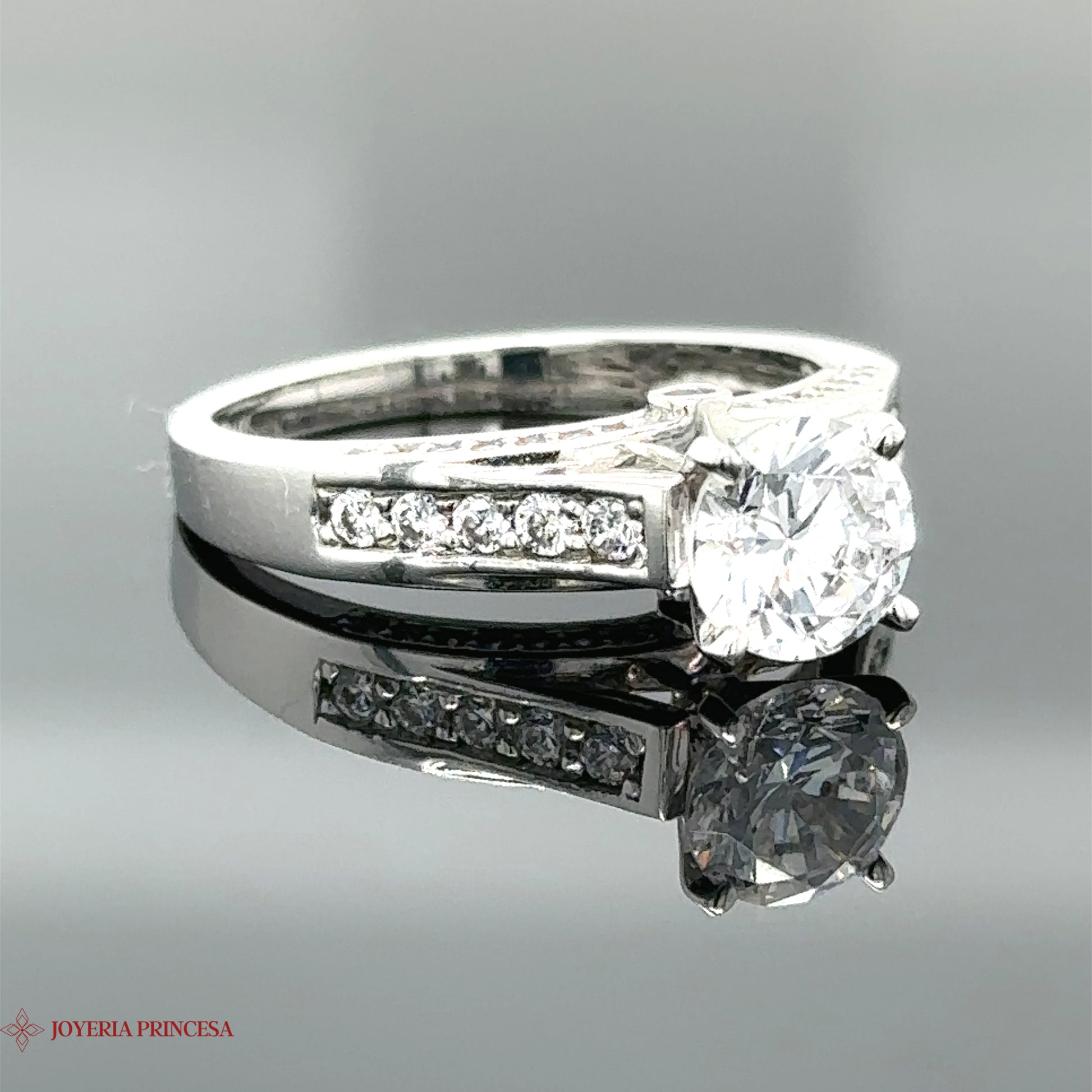 Viva el amor eterno con nuestro anillo de compromiso de oro blanco de 14 quilates, adornado con una circonita central y un luminoso halo de 10 circonitas.