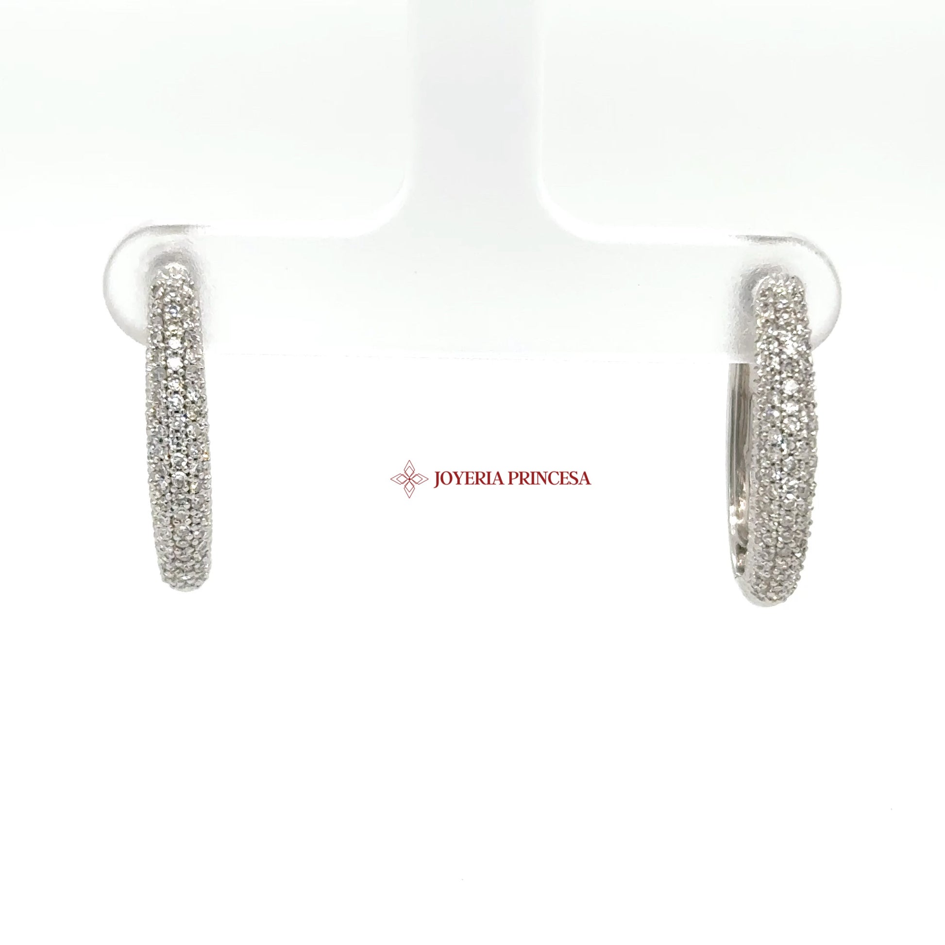 EN: Elevate your style with these stunning 14K white gold pave hoop earrings adorned with real diamonds. ES: Eleva tu estilo con estos impresionantes aretes de aro de oro blanco de 14K adornados con brillantes diamantes verdaderos.