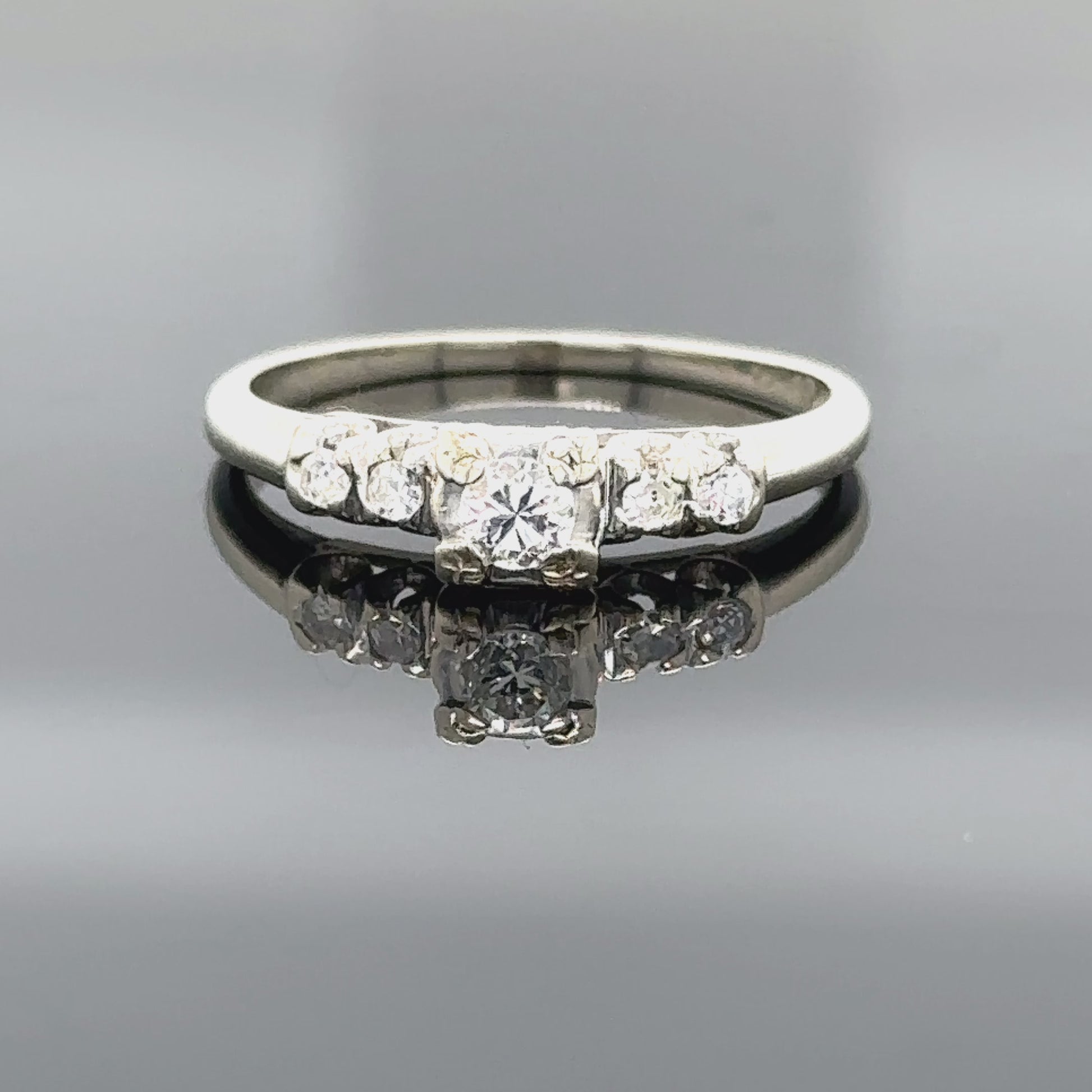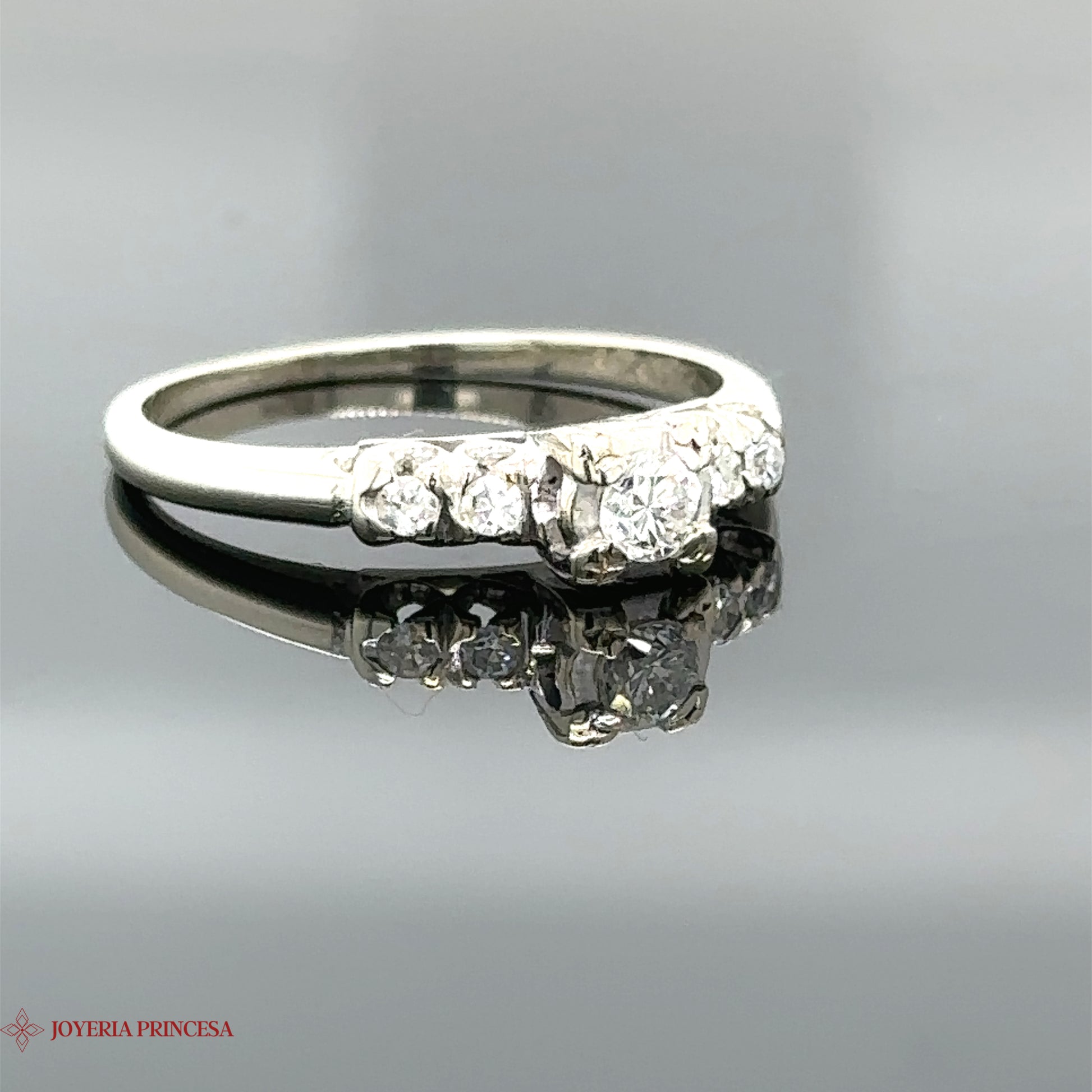 Celebre el amor verdadero con nuestro anillo de compromiso de oro blanco de 14 quilates con circonitas centrales y dos laterales. La elegancia clásica se une a la sofisticación moderna.