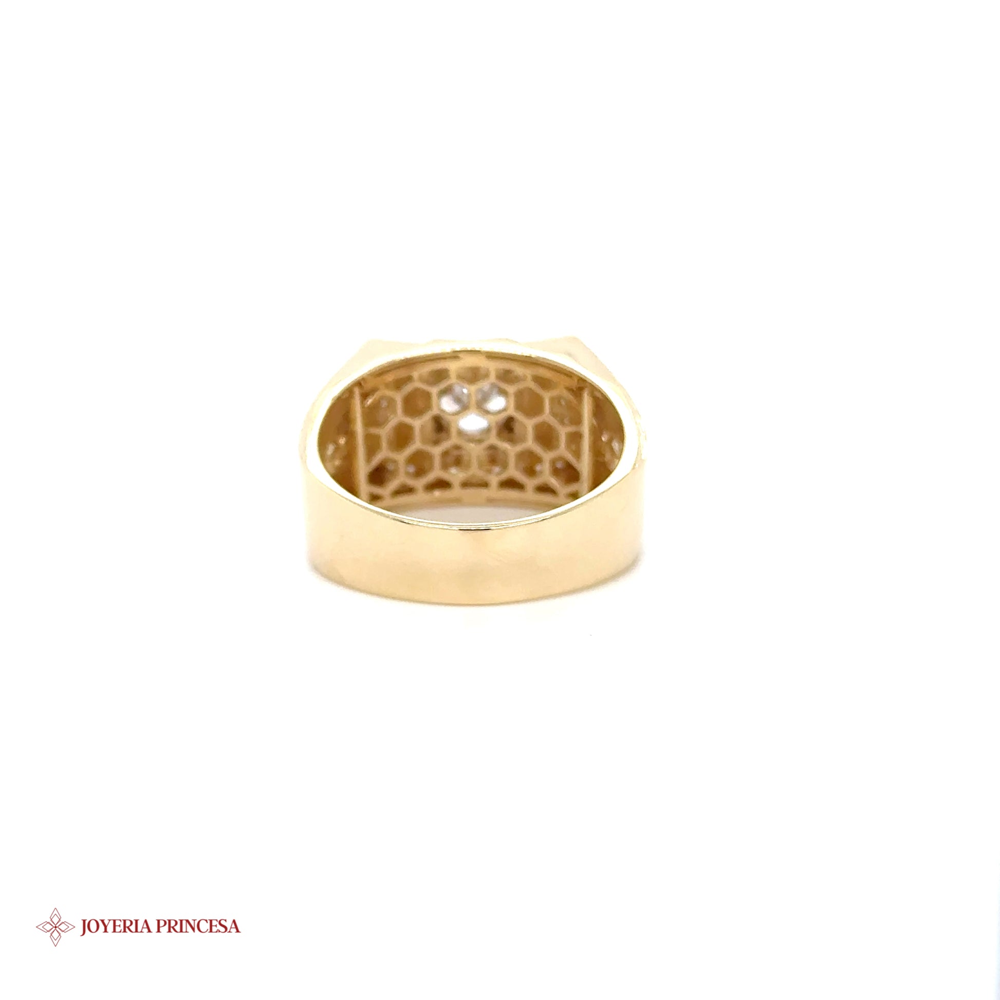 Anillo de oro de 14 quilates con una circonita central, diseño de corona y detalles adicionales de circonita.