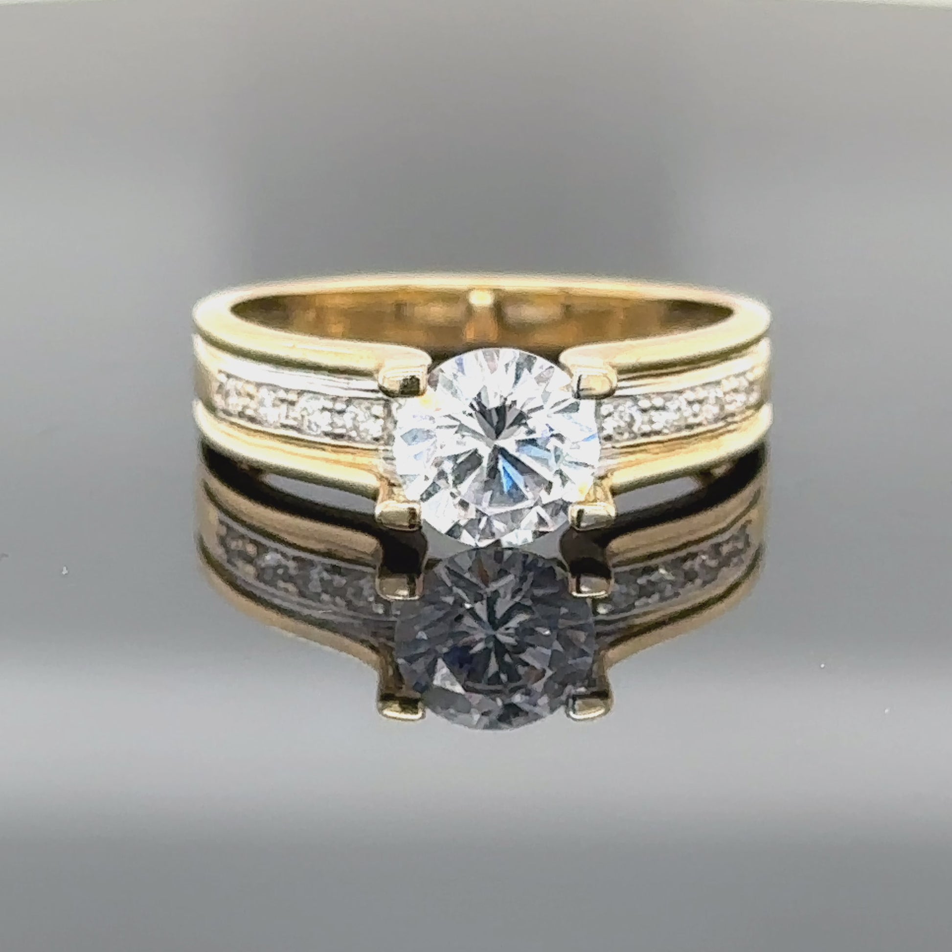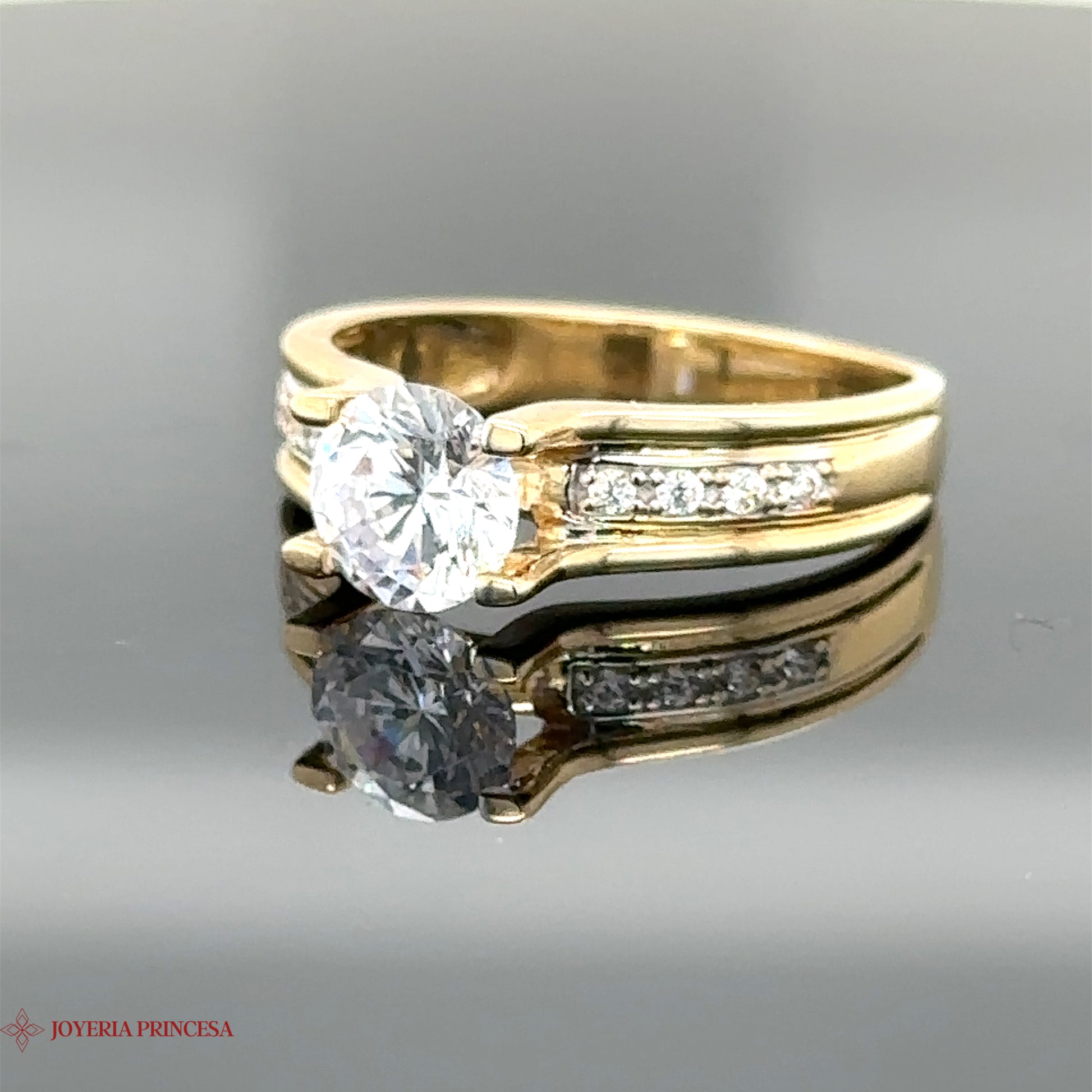 Descubra el anillo de compromiso de 14 quilates con deslumbrante piedra central de circonita e intrincado diseño de garras. Fusiona el estilo arquitectónico con el romanticismo atemporal.