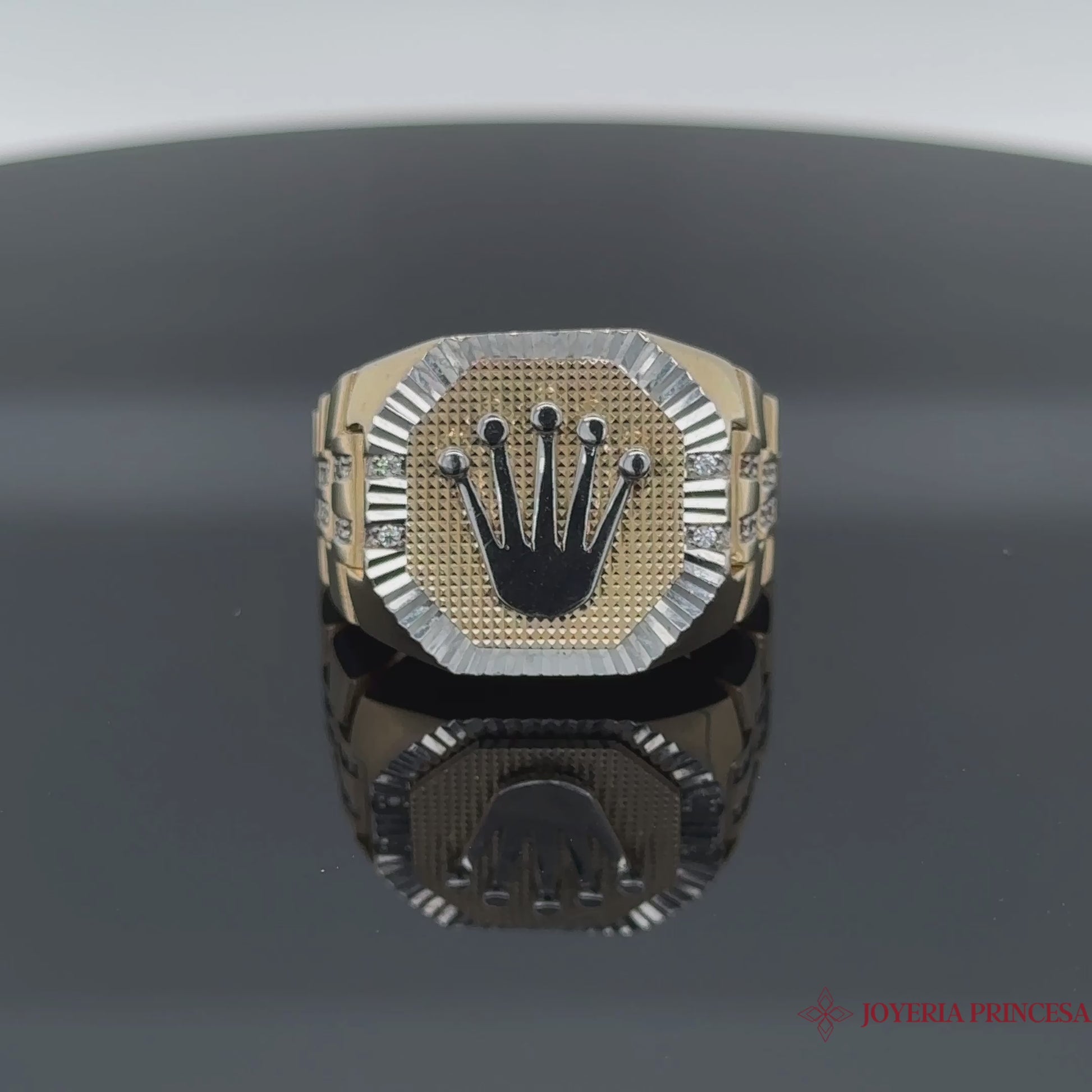Encarne el lujo y la sofisticación con este excepcional anillo Rolex de 14 quilates con corte de diamante. El intrincado patrón de corte de diamante, que delinea el icónico diseño de Rolex, crea una pieza cautivadora que exuda clase y refinamiento sin esfuerzo.