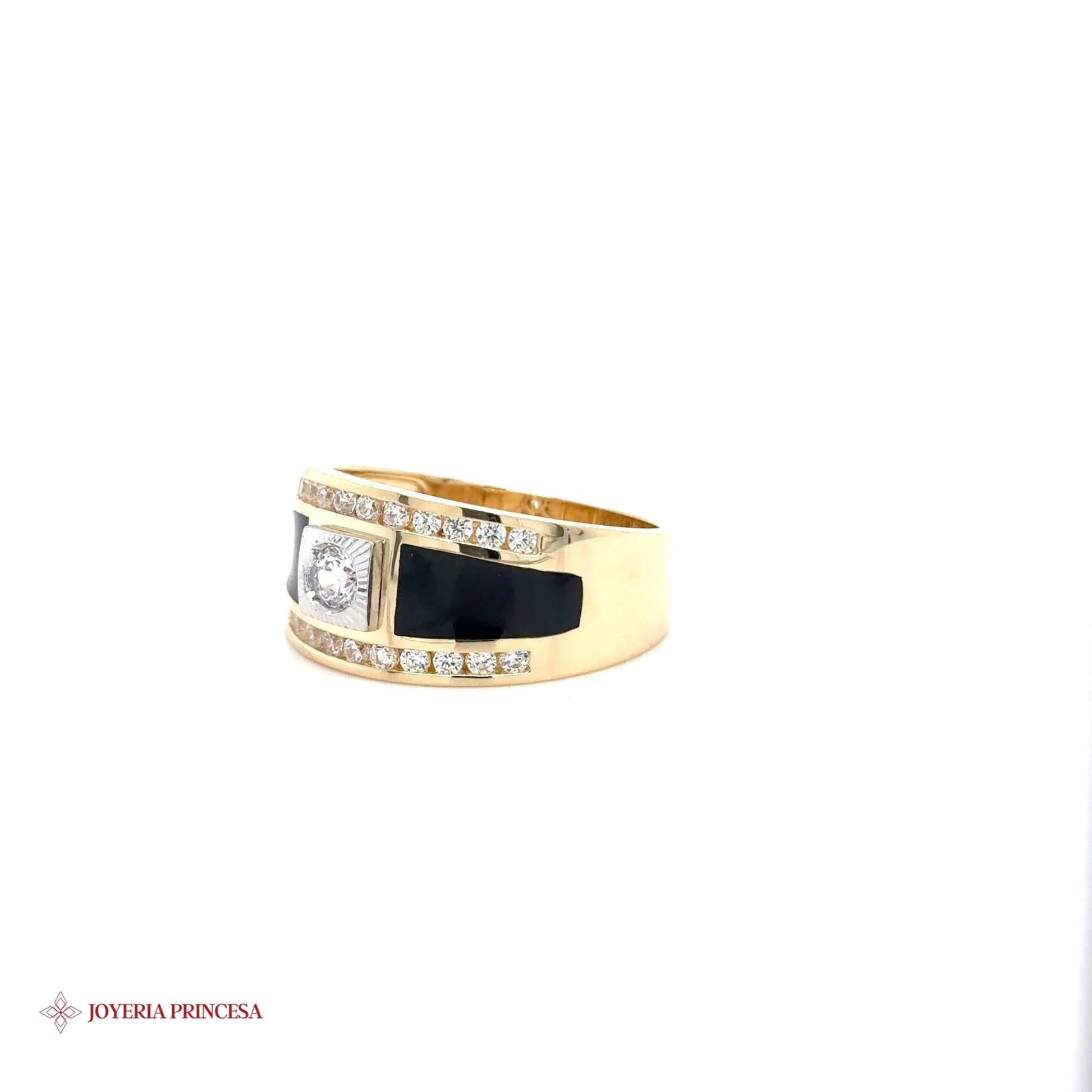 Elegante anillo de oro de 14 quilates con esmalte negro y detalles de circonitas