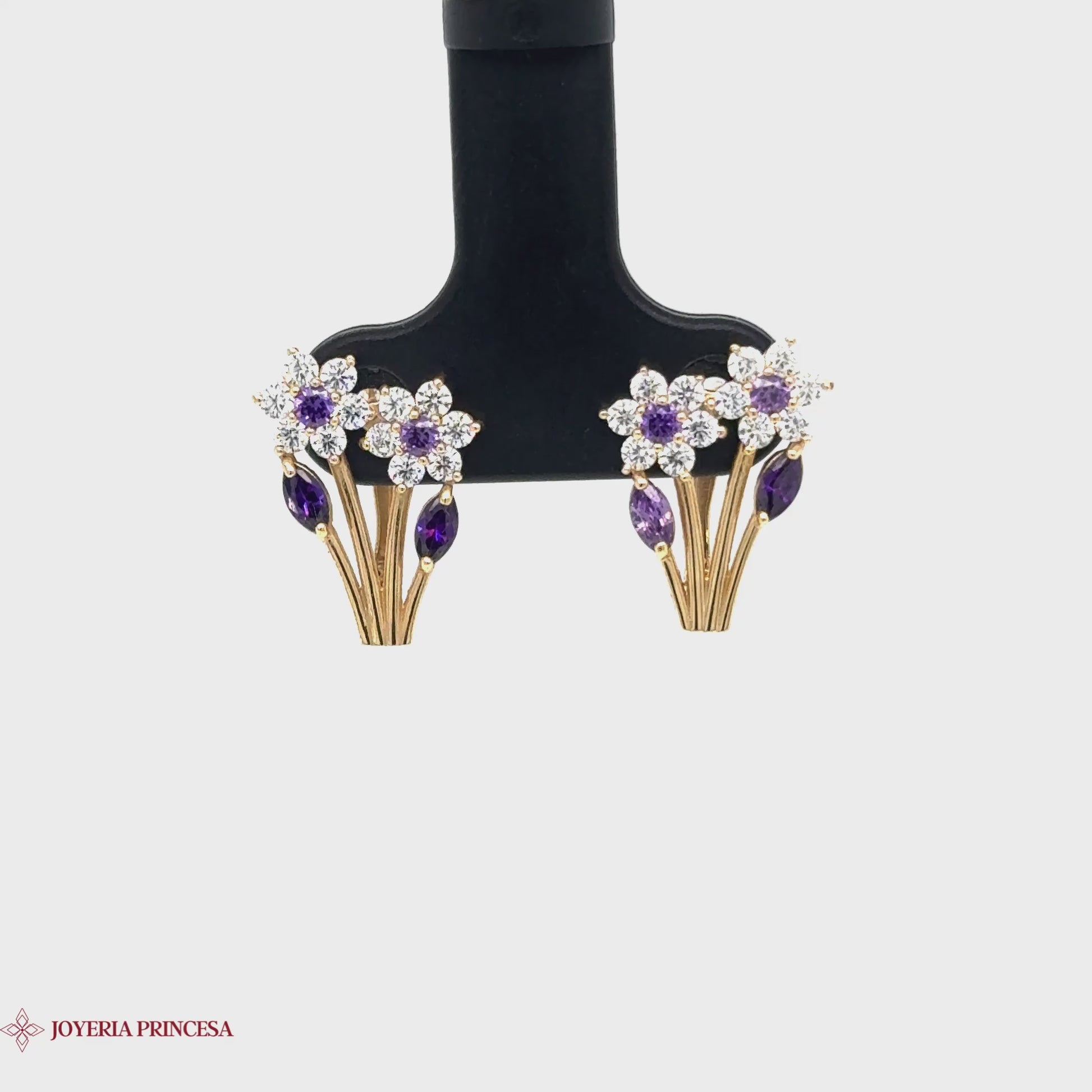 Elegantes Aretes florales de oro de 14 quilates con pétalos de gemas y destellos. Versátiles para llevar a diario o en ocasiones especiales, con piedras preciosas transparentes y moradas, diseño floral, ajuste cómodo, cierre seguro y tamaño elegante.