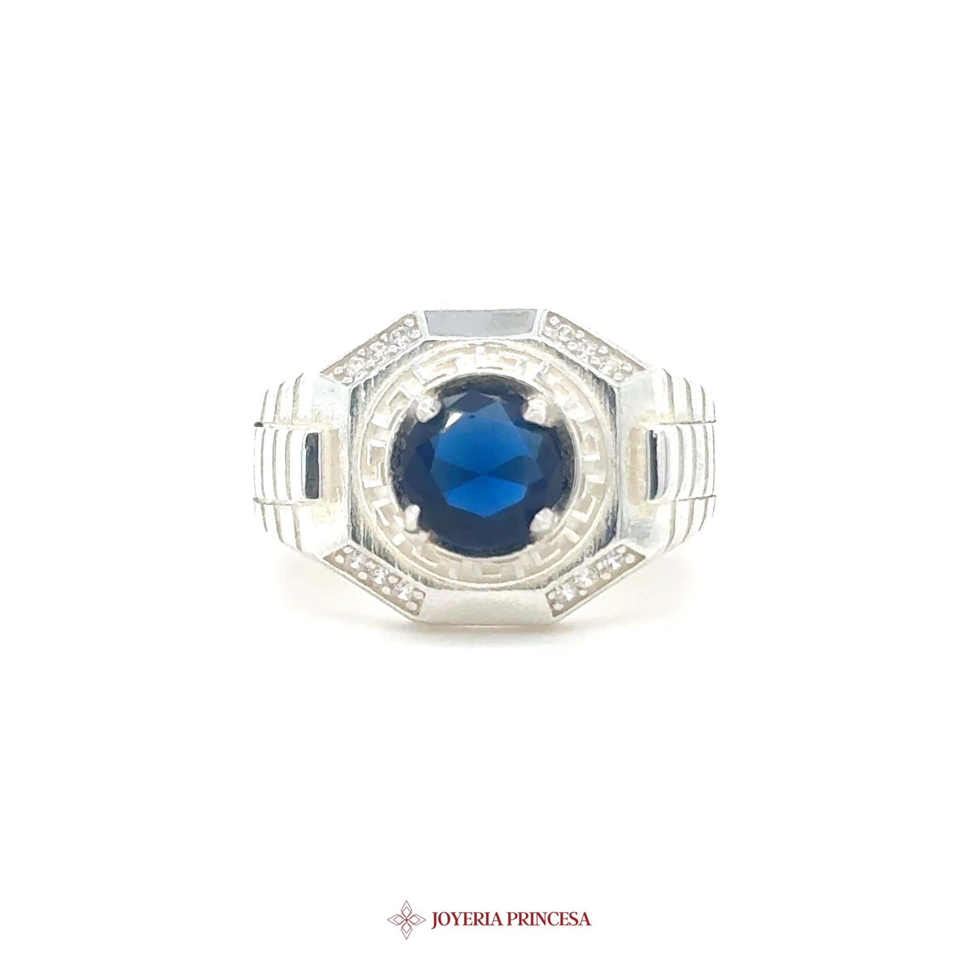 EN: A stunning silver ring featuring a deep blue center stone and intricate accent details. • Made from high-quality silver • Features a captivating blue stone • Designed with elegant patterns