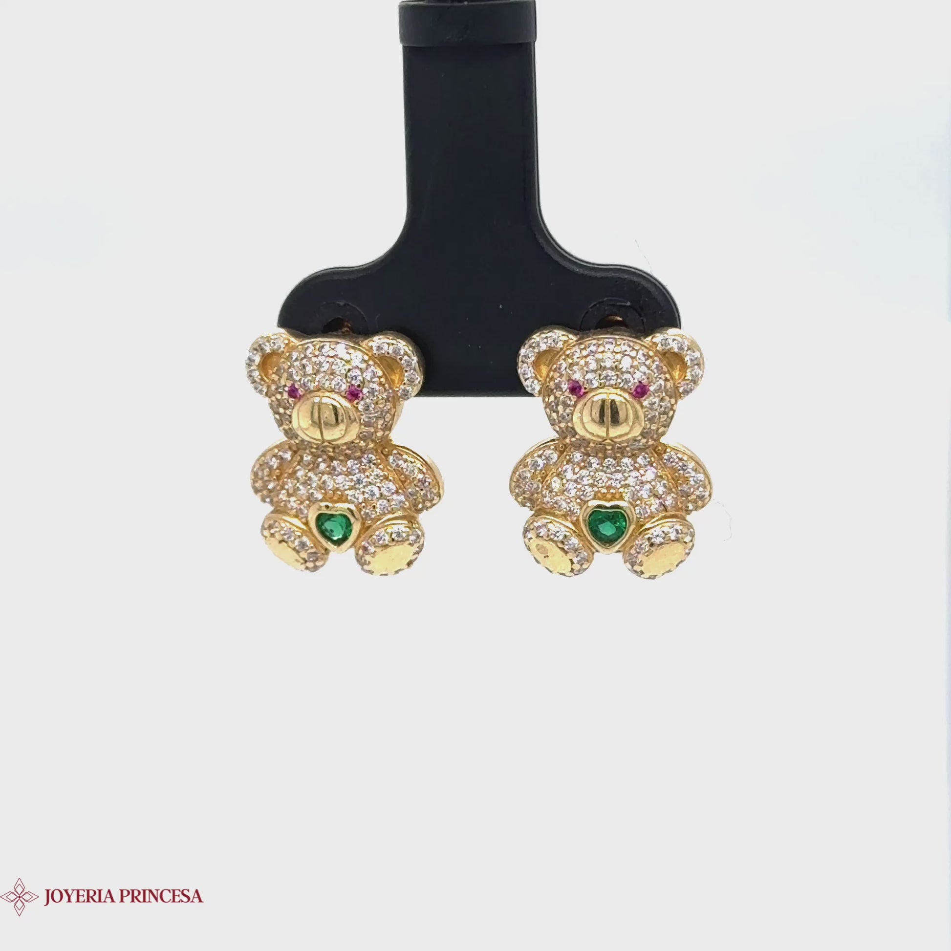 Disfruta del encanto de la infancia con los Aretes de osito de oro de 14 quilates con ojos de rubí, adornos de cristal y un corazón verde. Material: Oro de 14 quilates. Diseño: Adornos de cristal, detalles de color. Cierre: Cierre de mariposa seguro. Estilo: Caprichoso pero elegante. Detalles: Ojos de rubí, corazón verde.