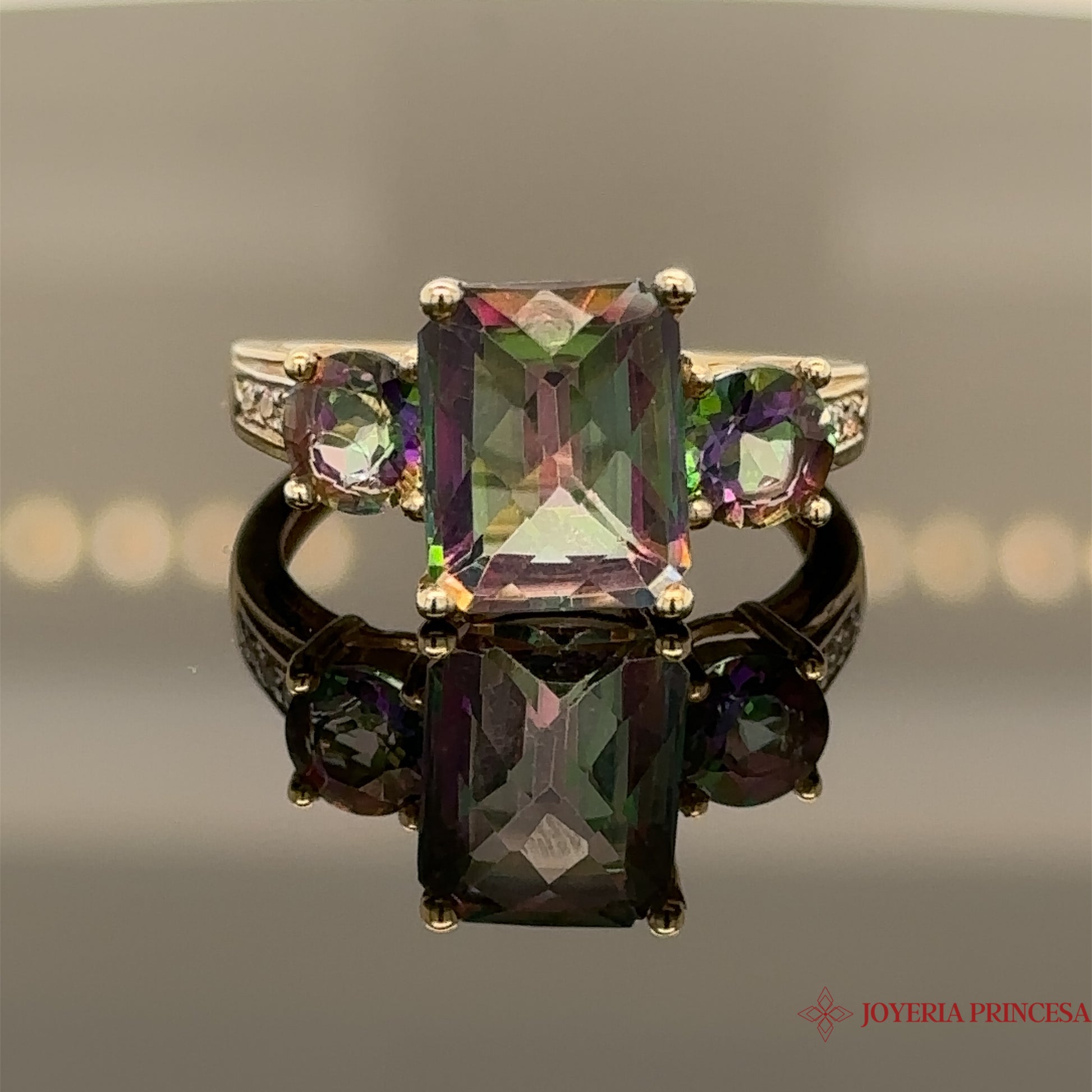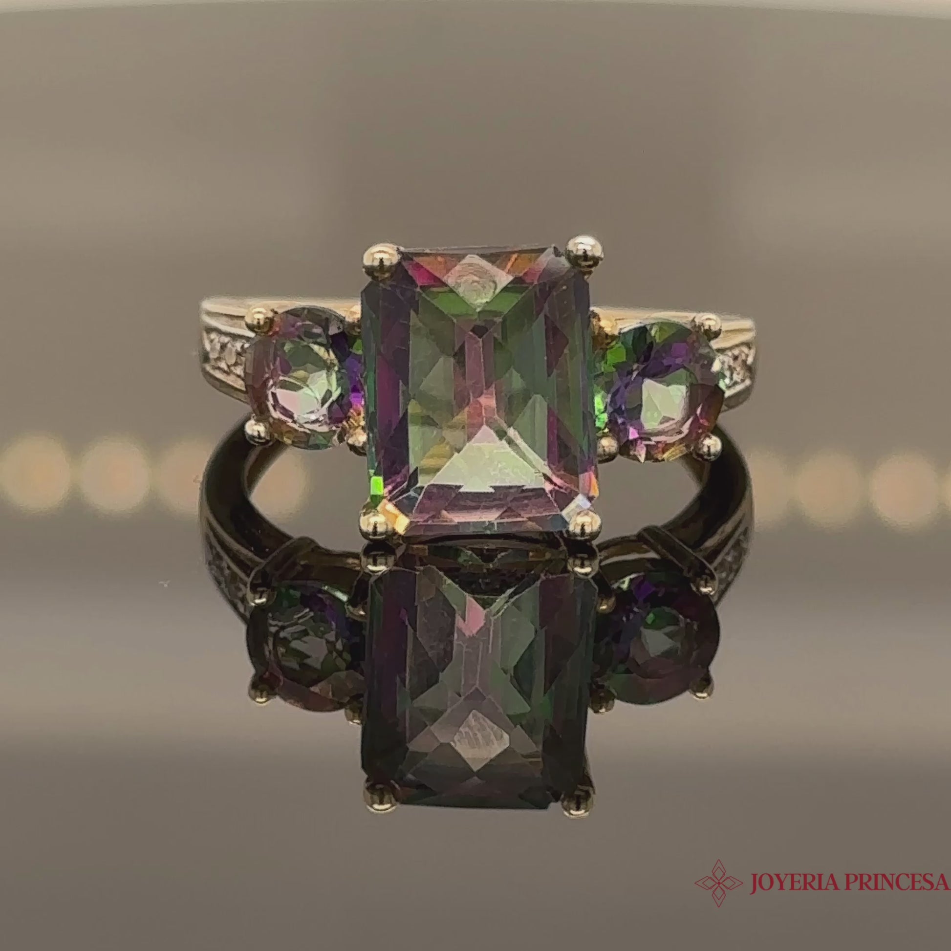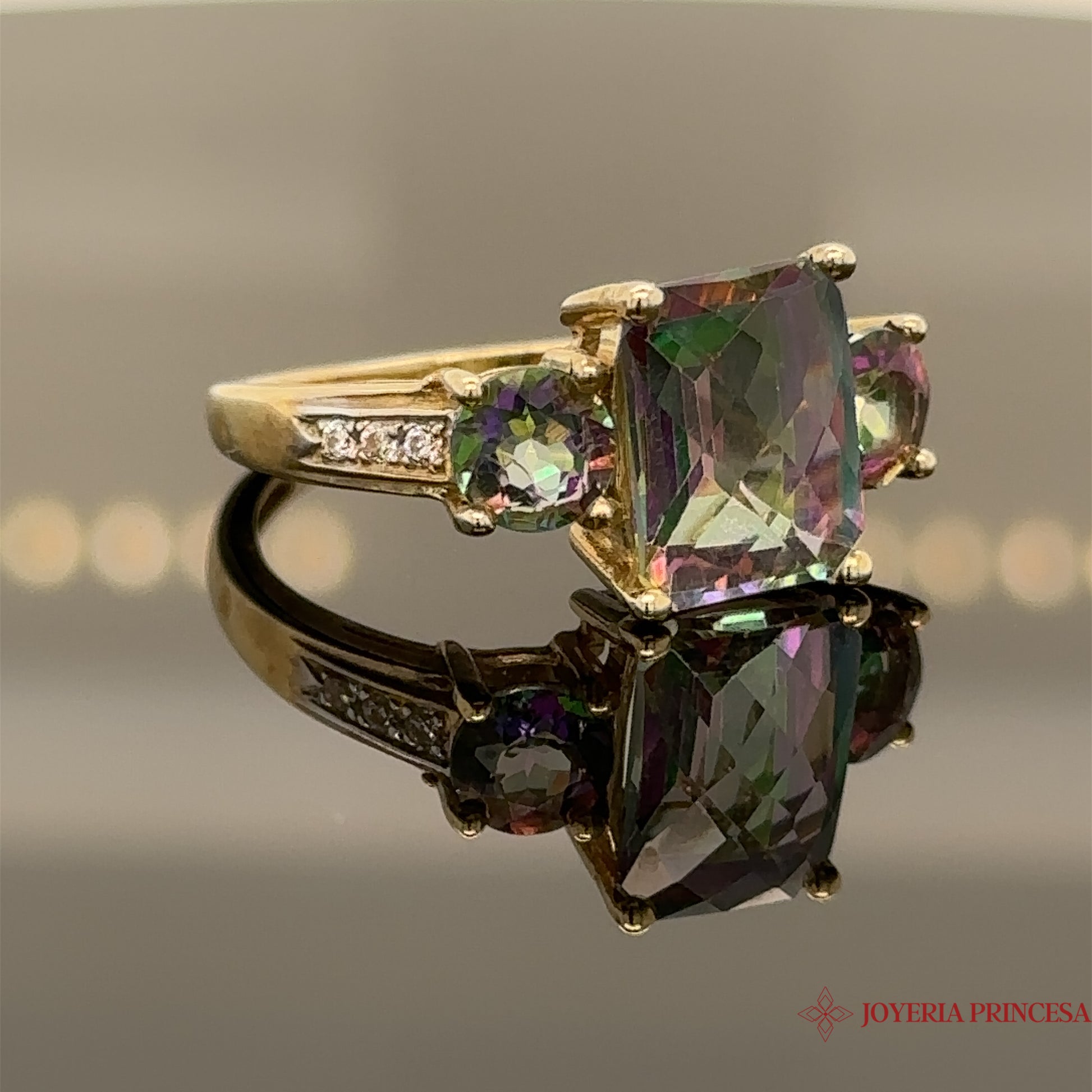 Celebre la magia del color con este encantador Anillo Tornasol Triple de 10K. Las tres gemas iridiscentes, que recuerdan al resplandeciente arco iris, crean una pieza cautivadora y caprichosa que añade un toque de encanto a cualquier look.
