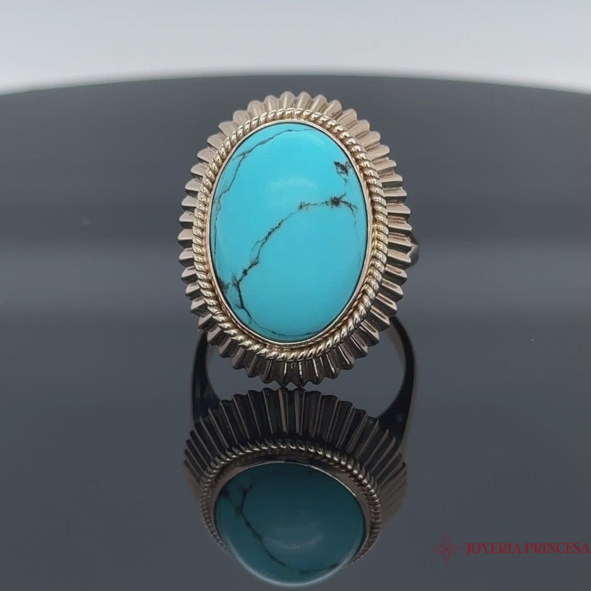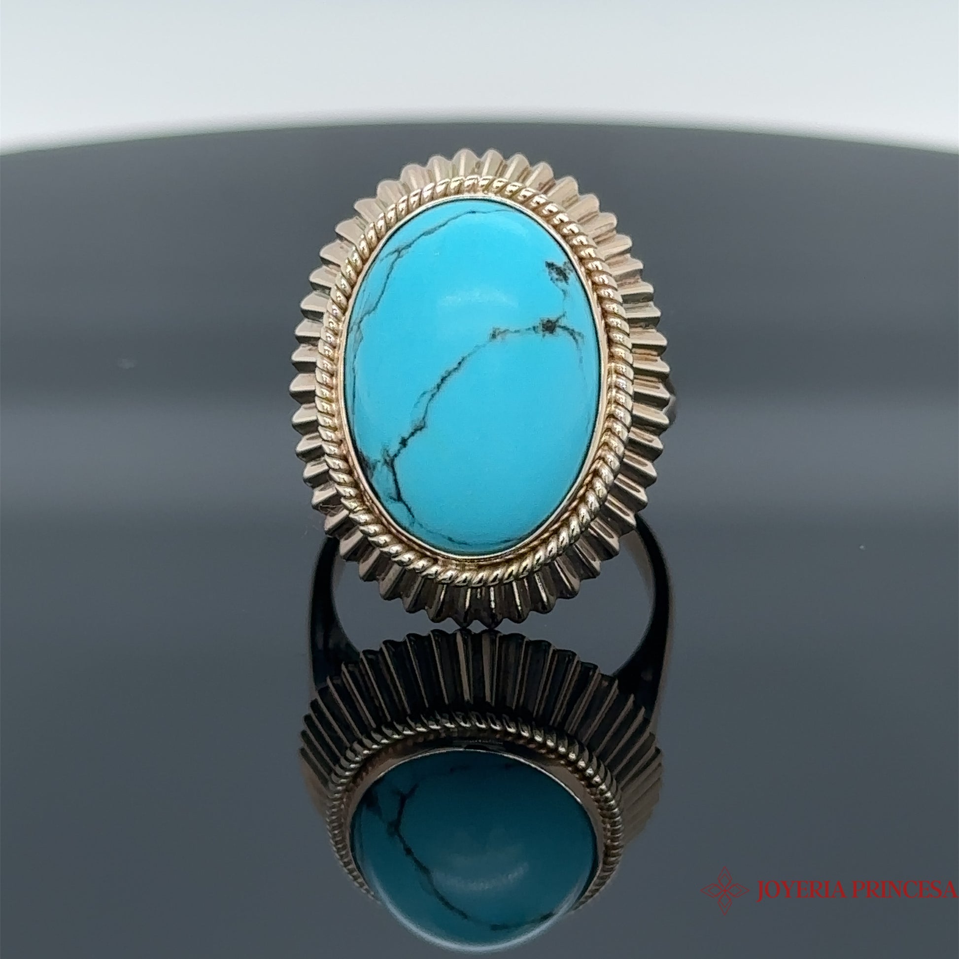 Sumérjase en la serenidad con el anillo ovalado de turquesa de 14 quilates. Impresionante gema turquesa engastada en una brillante banda de oro que aporta protección y equilibrio.