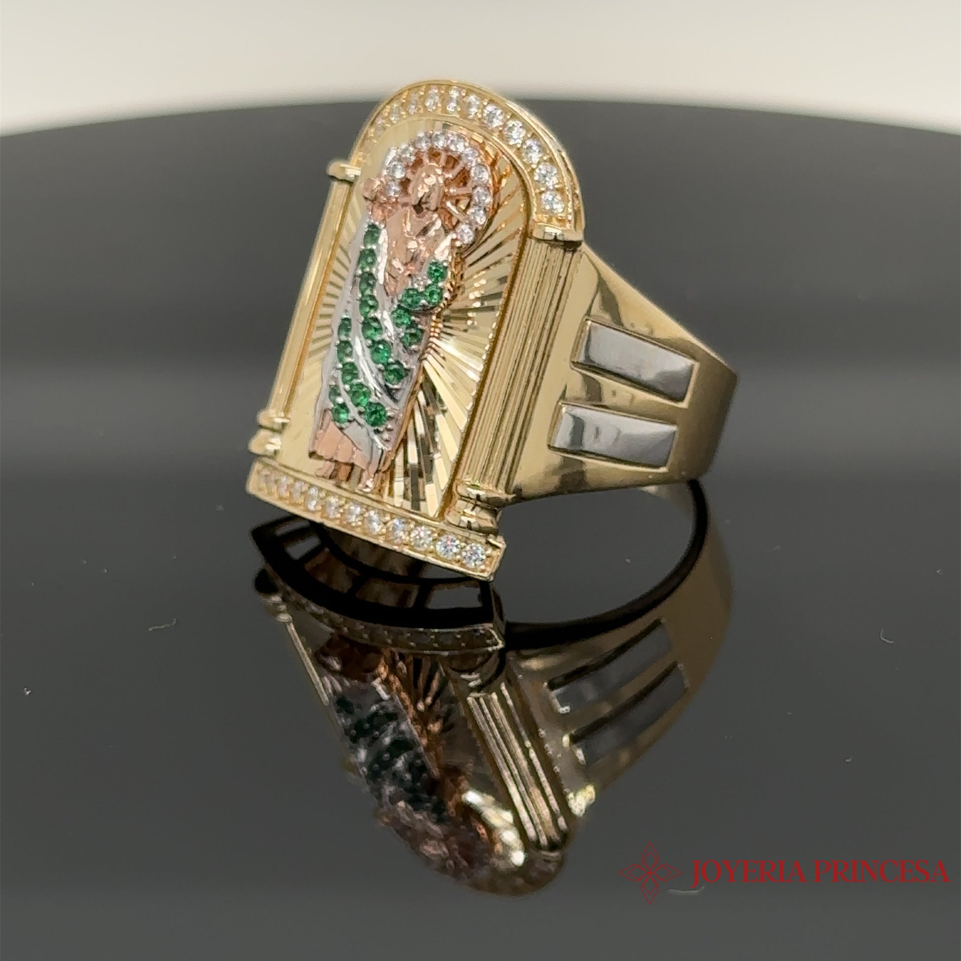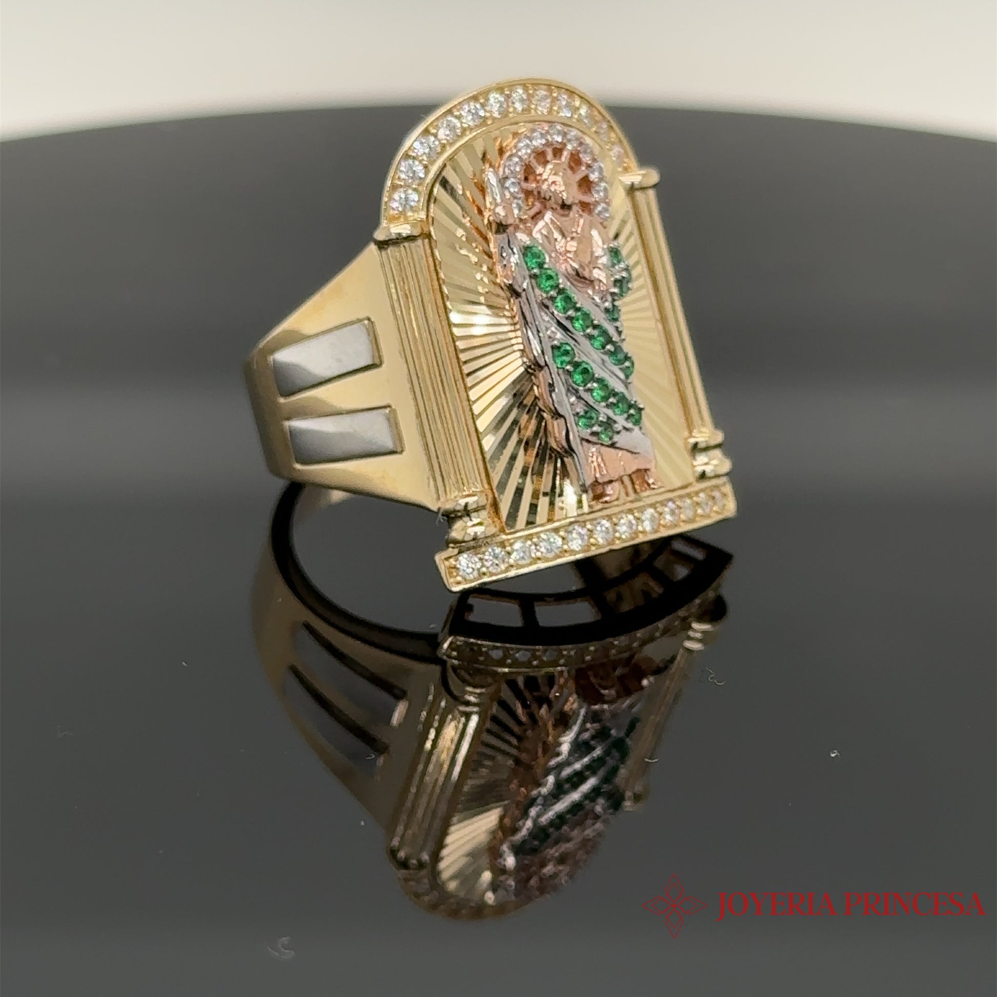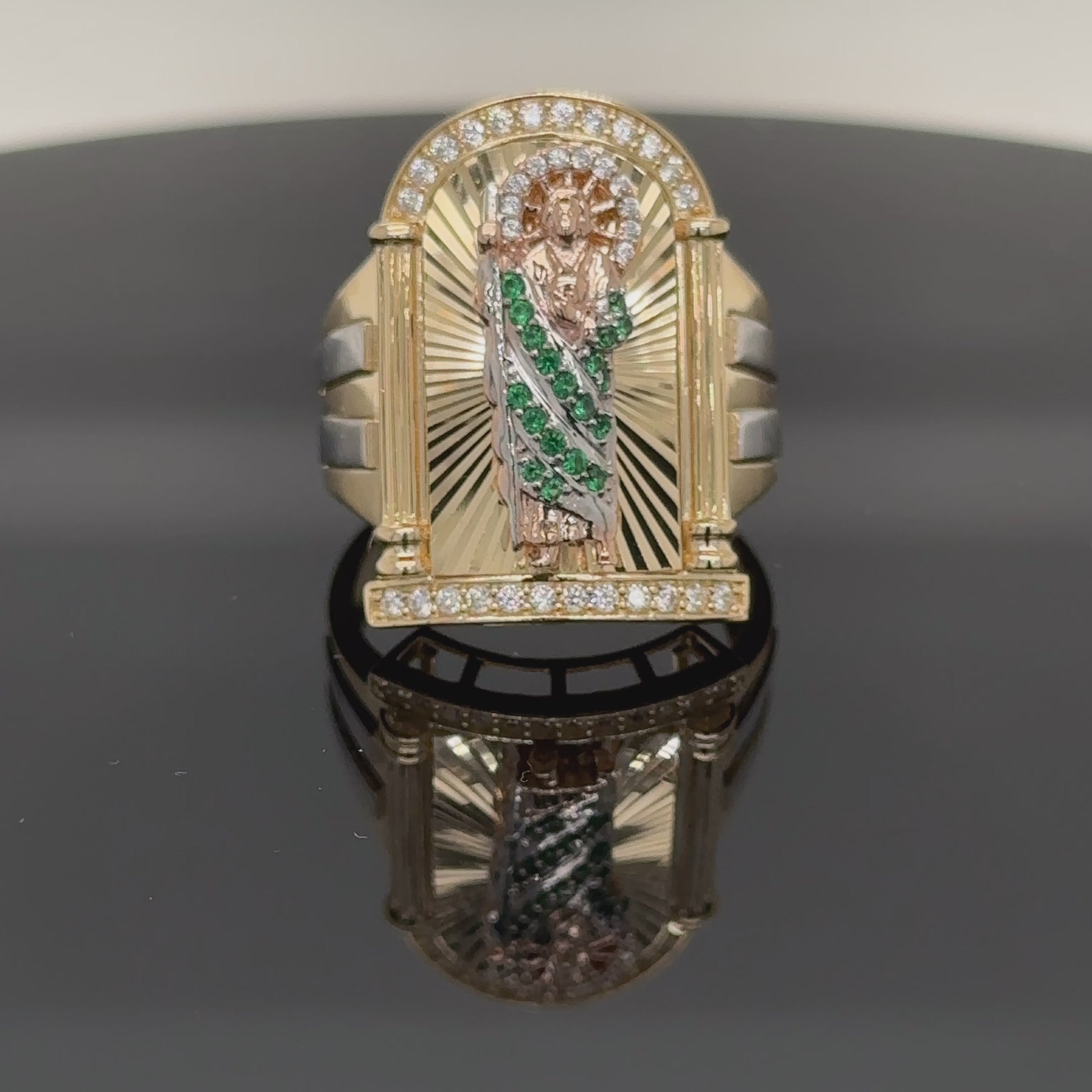 Descubra el Anillo de San Judas de 14 quilates, que muestra al amado santo en radiante oro rosa con brillantes detalles de circonitas verdes. Características: