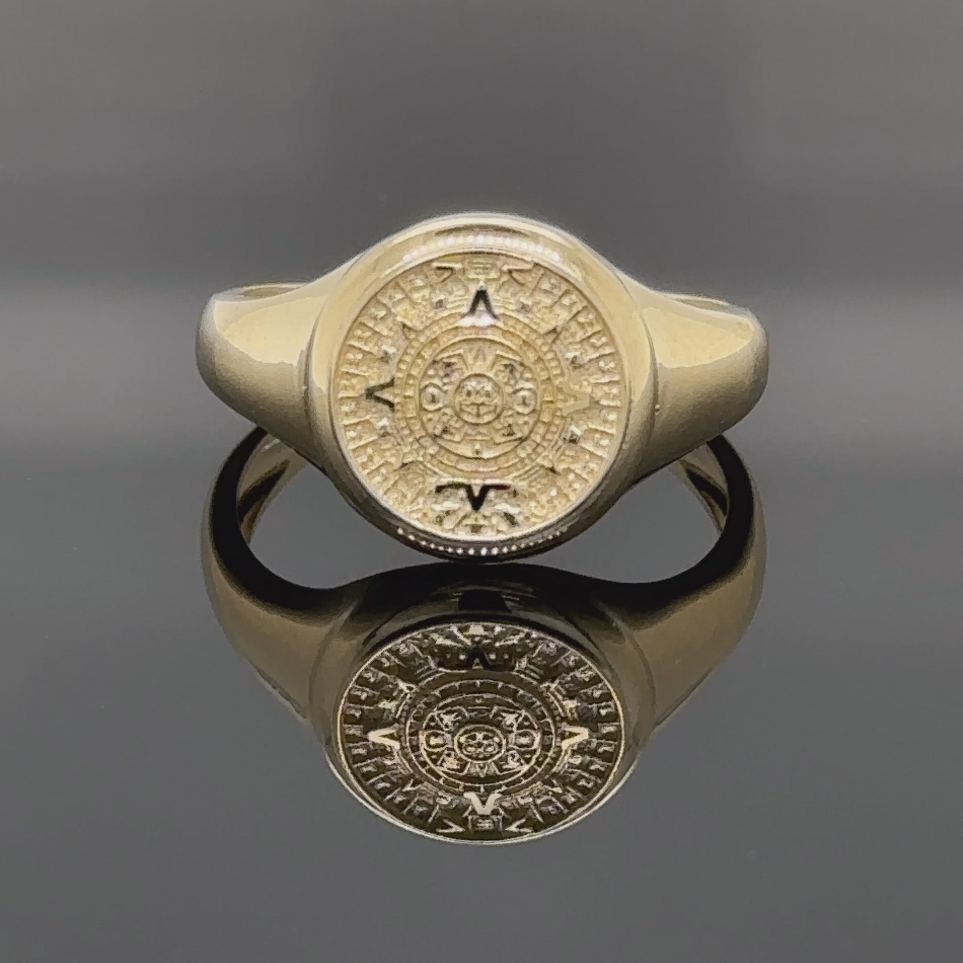 Adorne su mano con el Anillo Calendario Azteca de 14 quilates, con meticulosos símbolos antiguos sobre una lustrosa banda de oro. Finísimo oro de 14 quilates, detallado diseño de calendario, significado narrativo.
