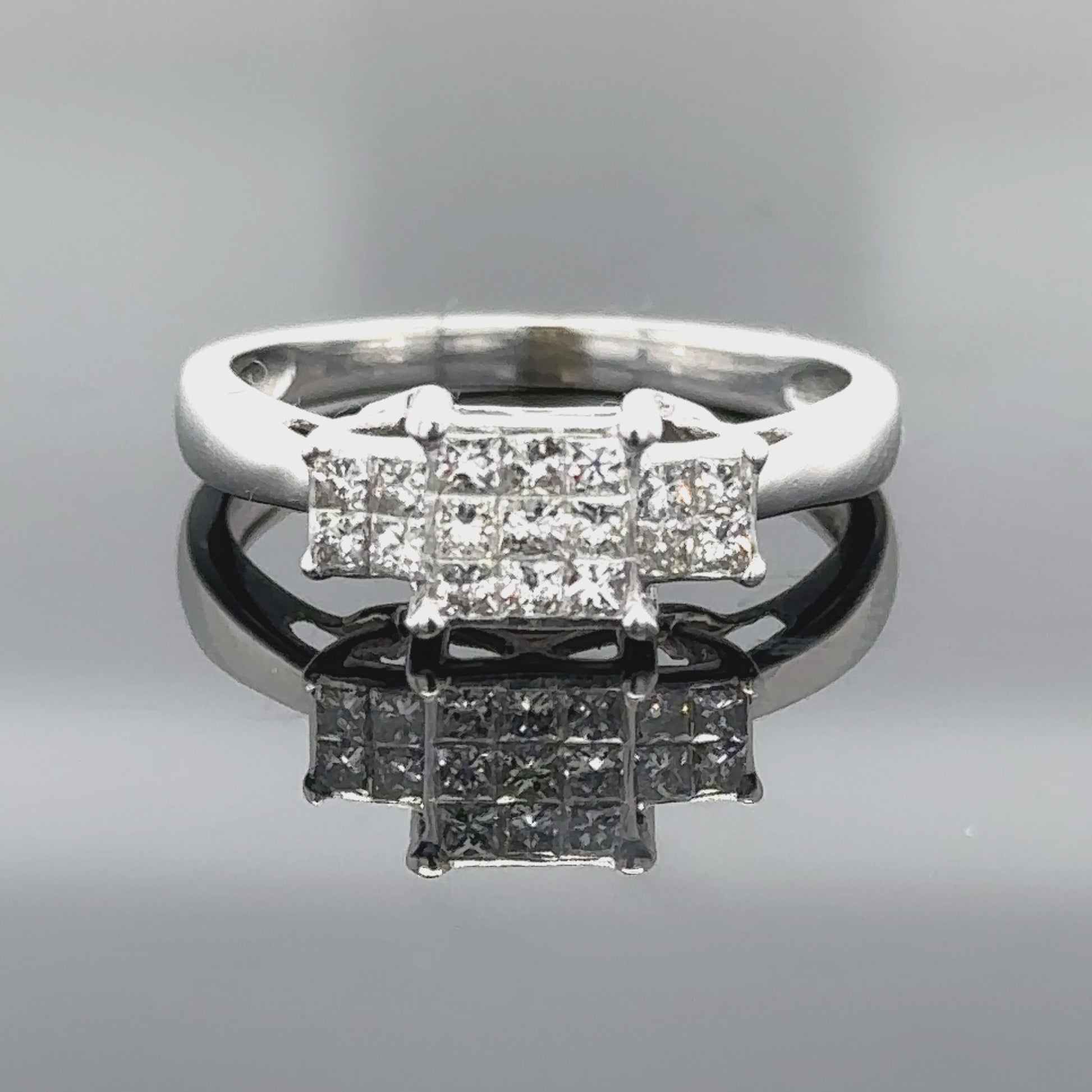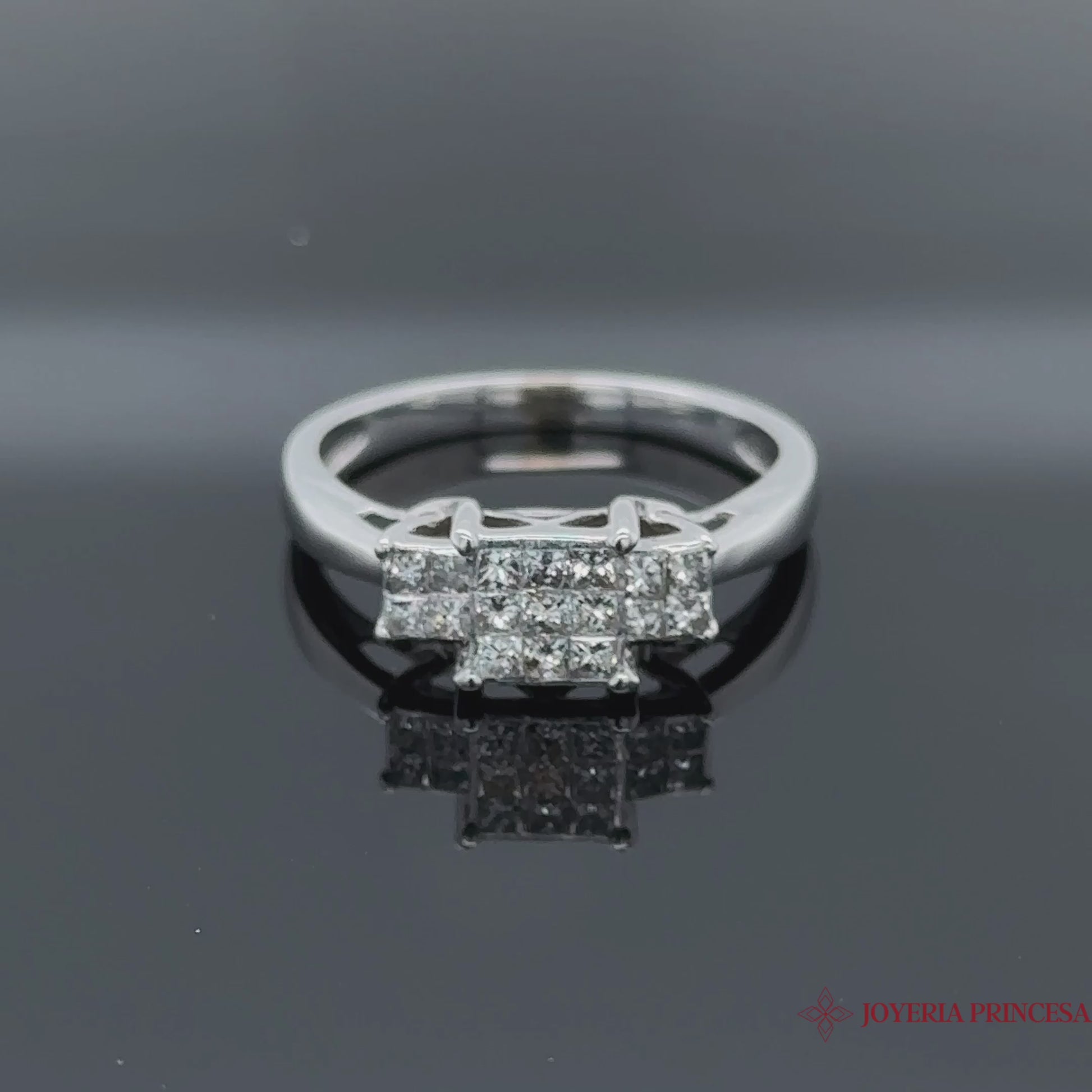 Eleve cualquier propuesta con este refinado anillo de oro blanco de 14 quilates con un racimo de diamantes 3x3 flanqueado por diamantes adicionales. Características principales: